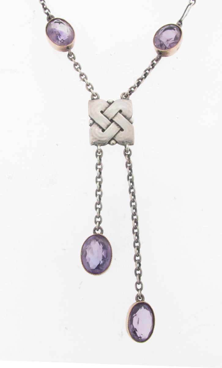Murrle Bennett & Co, an amethyst set silver necklace, circa 1905, with centre square section Celtic Knot panel and four oval shaped amethysts, stamped MB&Co 950.