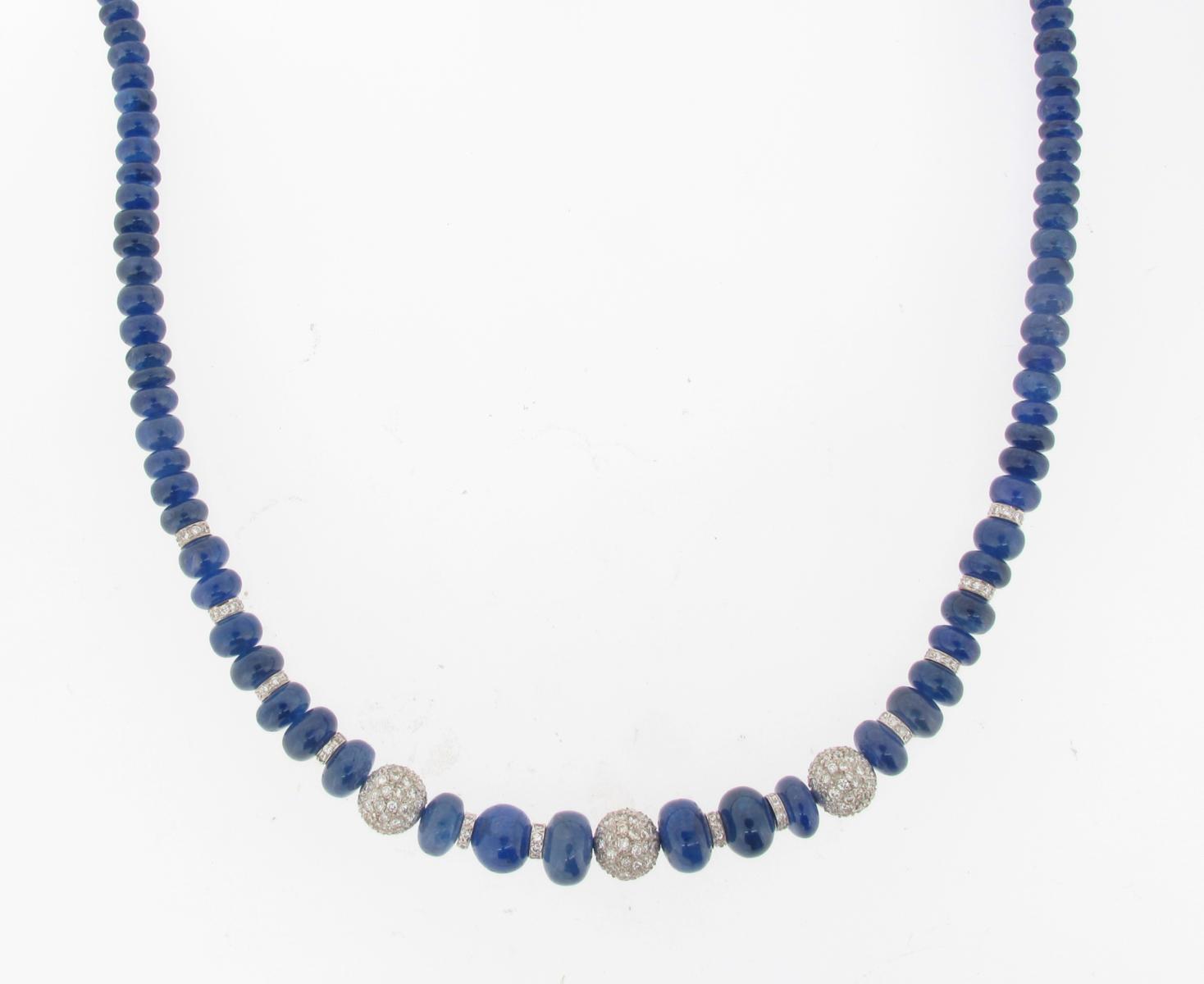A sapphire bead and diamond necklace. The graduated sapphire beads are separated with three pave...