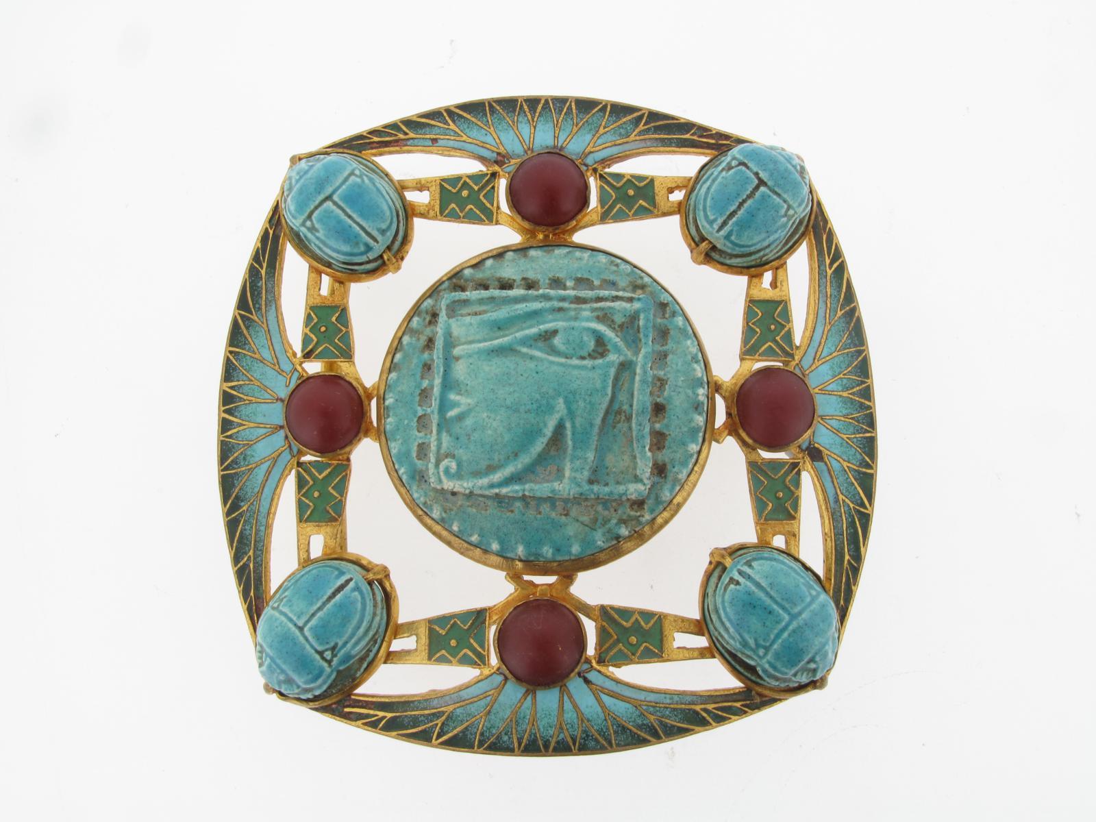 A Piel Freres Egyptian Revival enamelled metal belt buckle, rounded square section, set with a faience scarab beetle to each corner, central eye panel, with enamelled lotus fan stamped marks 7.0cm. wide.