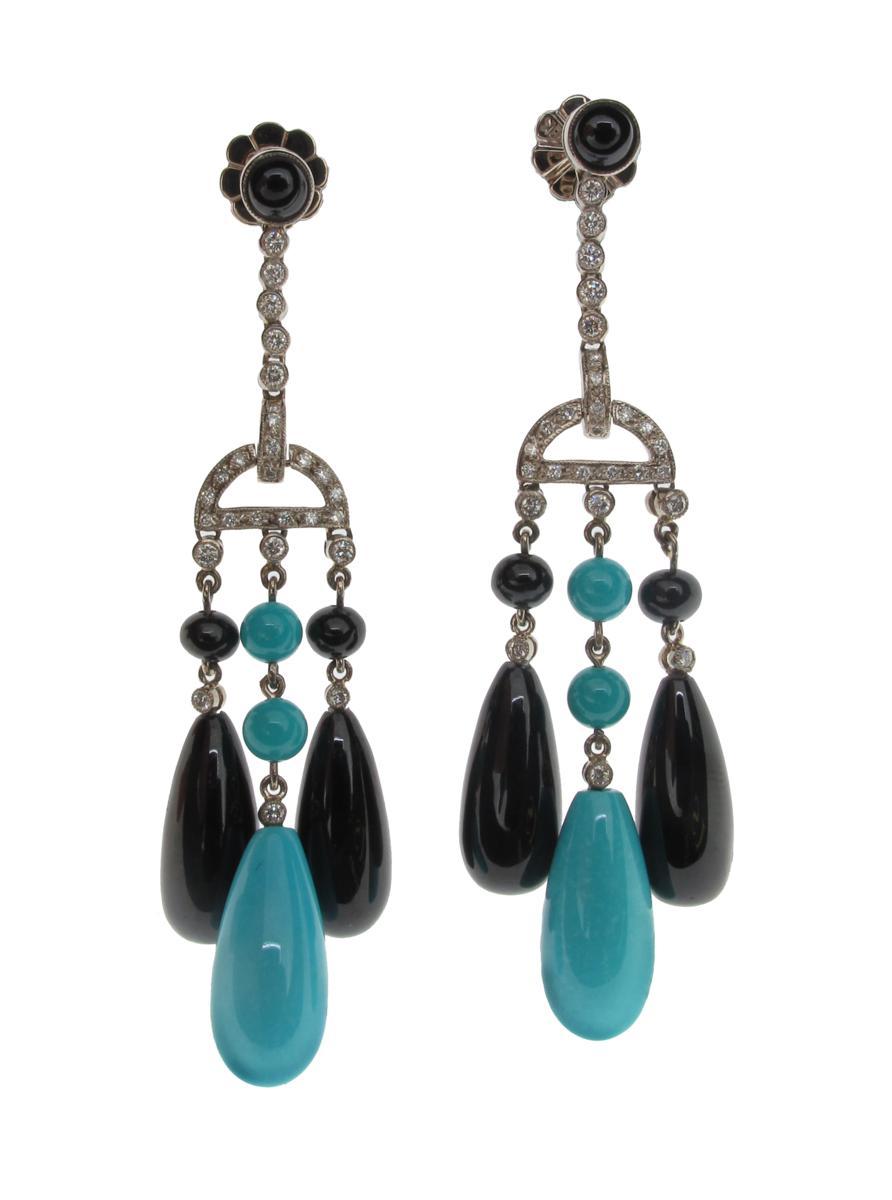 A pair of turquoise diamond and black onyx drop earrings