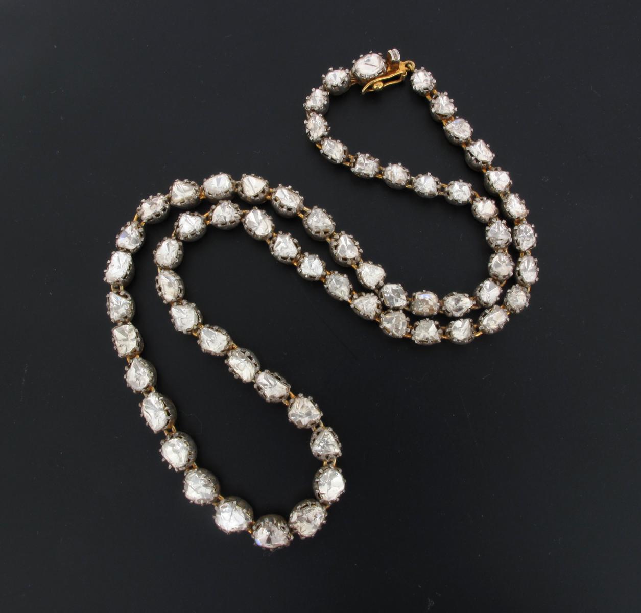 A diamond necklace, designed as graduated cut down silver and gold colets, each mounted with a diamond section. 41cm.