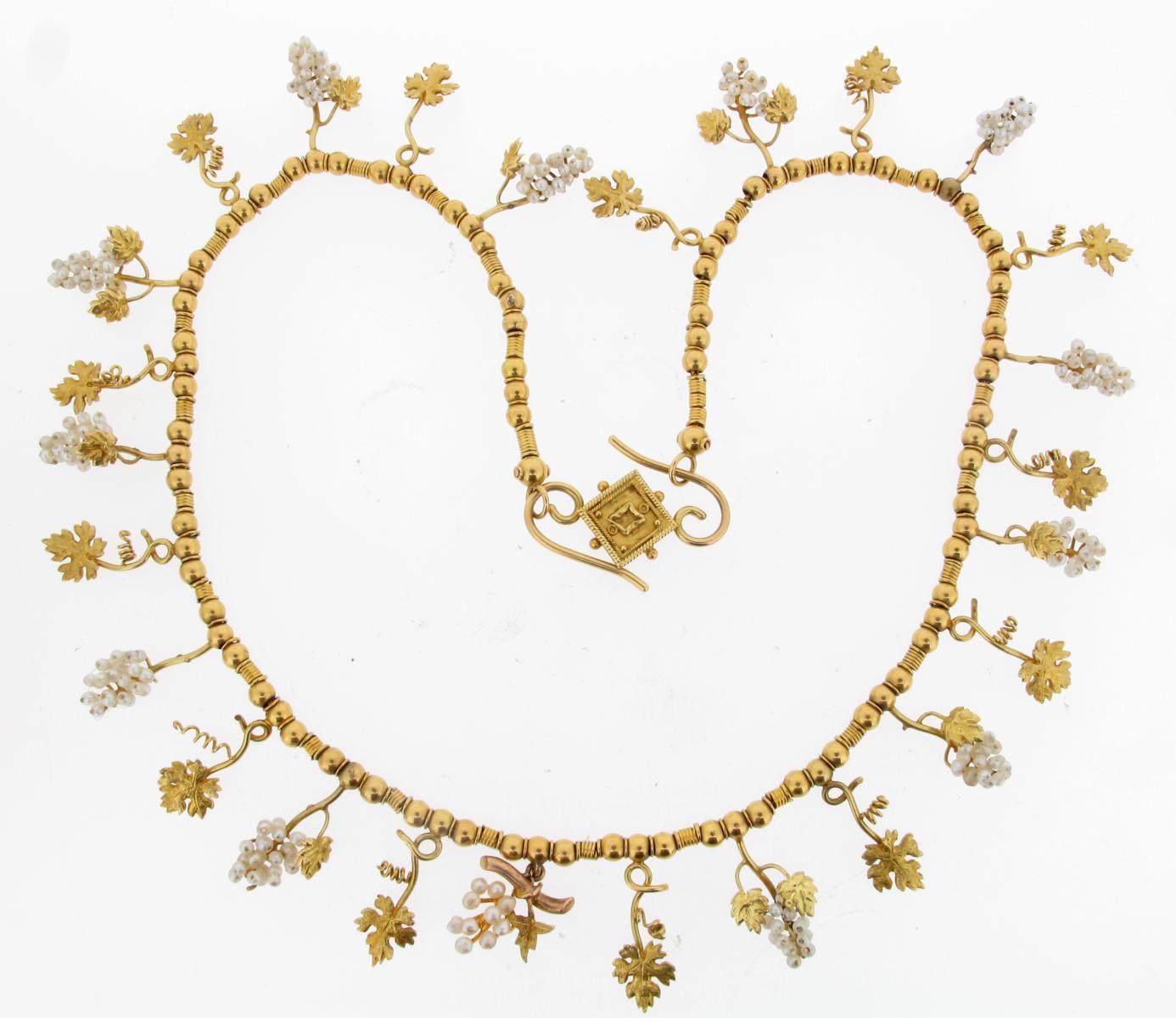 A 19th Century fruiting vine necklace, alternately mounted with realistically formed seed pearl set grapes and gold leaf sections with tendrils. 39cm.