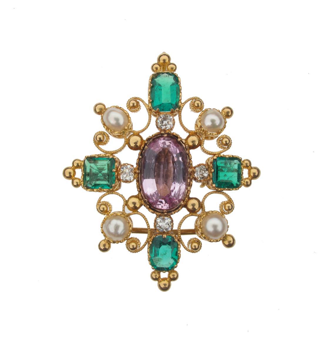 An early 19th Century gold brooch centred with an oval shaped pink topaz, four emeralds, four diamonds and four half pearls in a filigree gold mount.