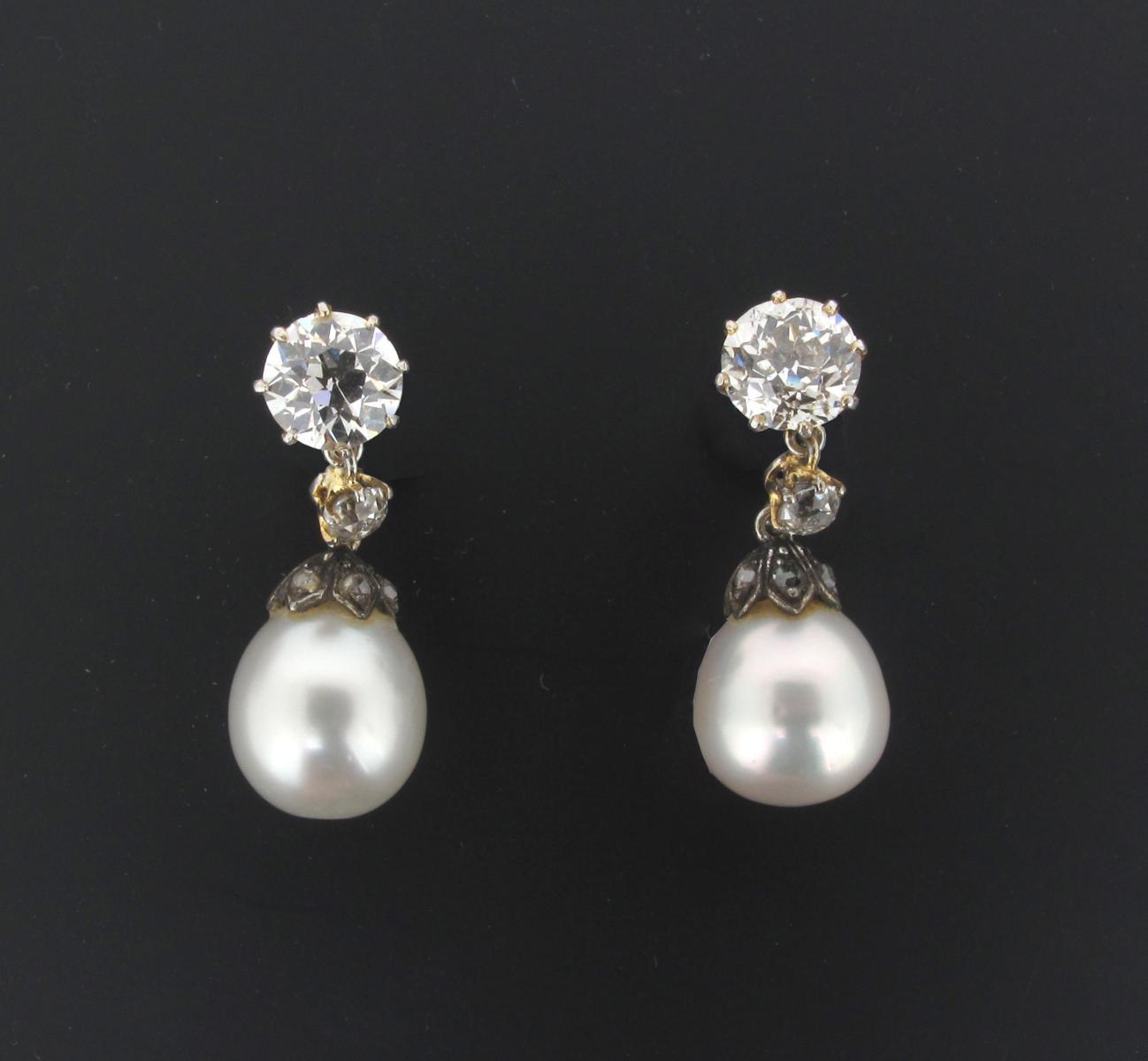 A pair of cultured pearl and diamond drop earrings, the slightly pear-shaped cultured pearls each suspend from a circular-cut diamond and smaller diamond with diamond set caps, each pearl measures 9.5 and 9.6mm diameter.