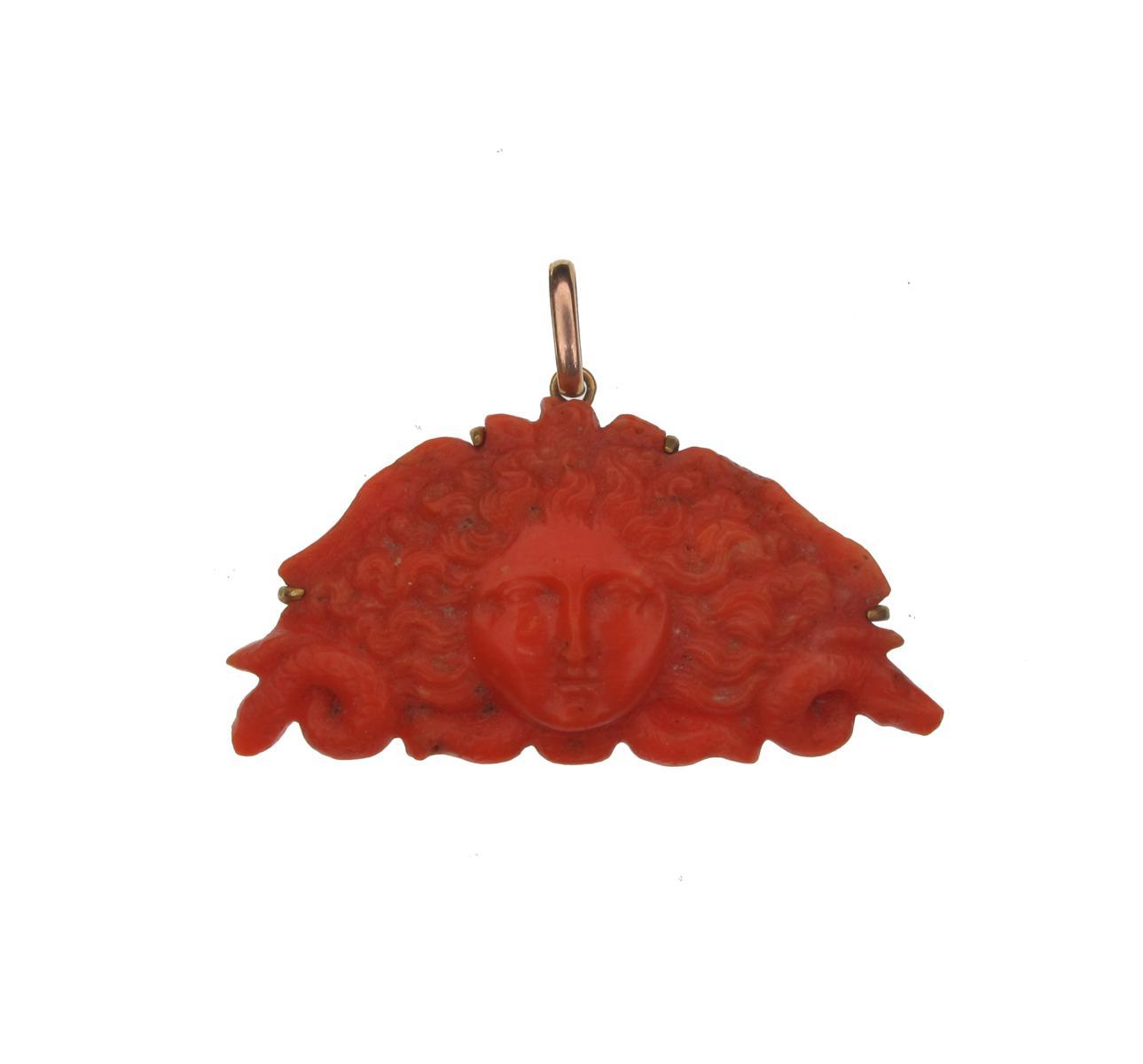 A carved coral pendant, depicting the head of Medusa with gold pendant loop. 4.4cm wide.