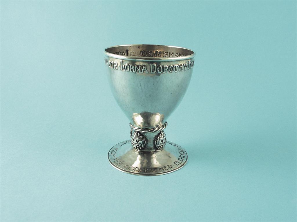 By Ramsden & Carr: an Edwardian goblet with applied Leopards' heads around the stem, and raised inscription 'I was wrought for Lorna Dorothy , Fuller-Clark, May 22 1901', the foot chased, 'a gift from her godmother Eleanor Pomeroy' London 1901, 3.9in (10cm)high, 3.5oz.