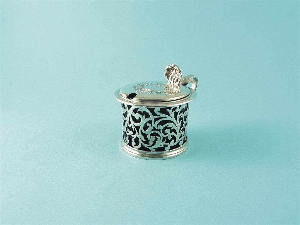 A Victorian pierced mustard pot, with blue glass liner, an engraved cover and a shell thumbpiece, crested, by Charles Thomas and George Fox, London 1845, 2.75in (7cm)high, 3oz weighable silver.