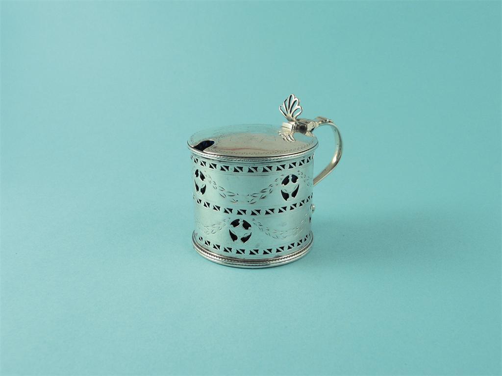 A George III engraved mustard pot, pierced with urn motifs and repeating borders of scrolls, crested and initialled, by James Stamp and John Baker, London 1783, 2.75in (7cm)high, 3oz weighable silver.