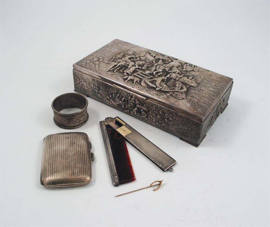 A mixed lot: plated cigarette box, together with a cased horseshoe stickpin, a folding comb and engraved napkin ring with gadrooned border and a small cigarette case. (5)