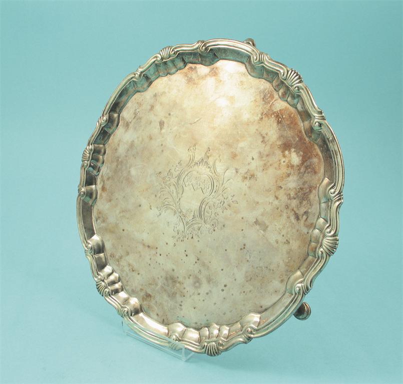A George II salver, of shaped circular outline, the centre engraved with a crest, by William Peaston, London 1748, 10.5in (26.6cm), 18oz.