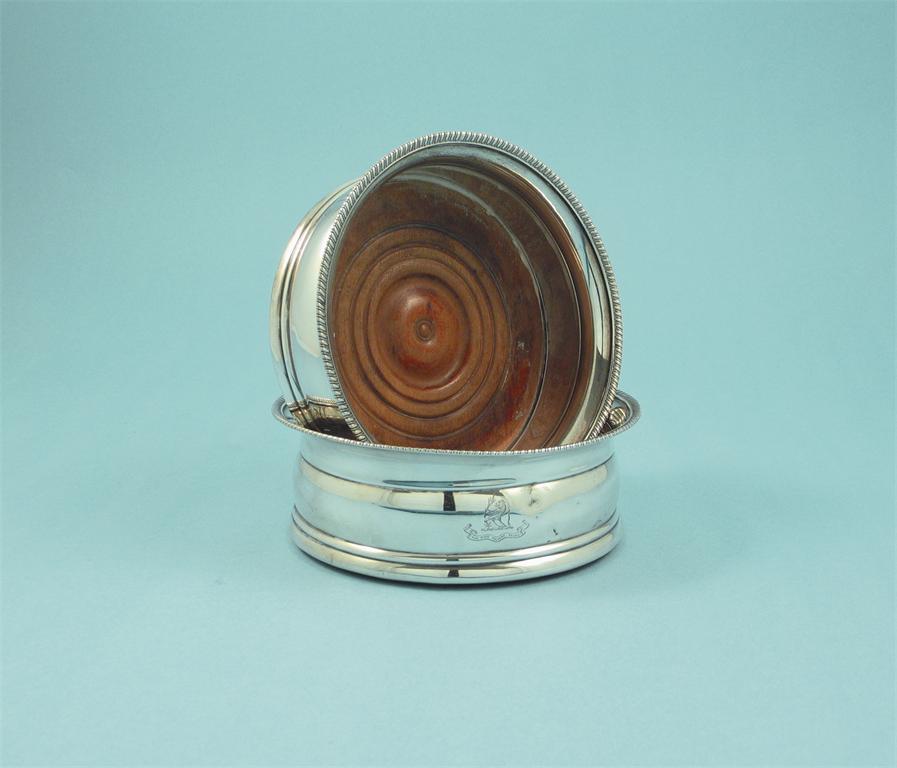 A pair of George III wine coasters, with everting gadrooned rims, and turned wooden bases, crested, makers marks worn, London, 1807, 5.5in (14cm) diameter.