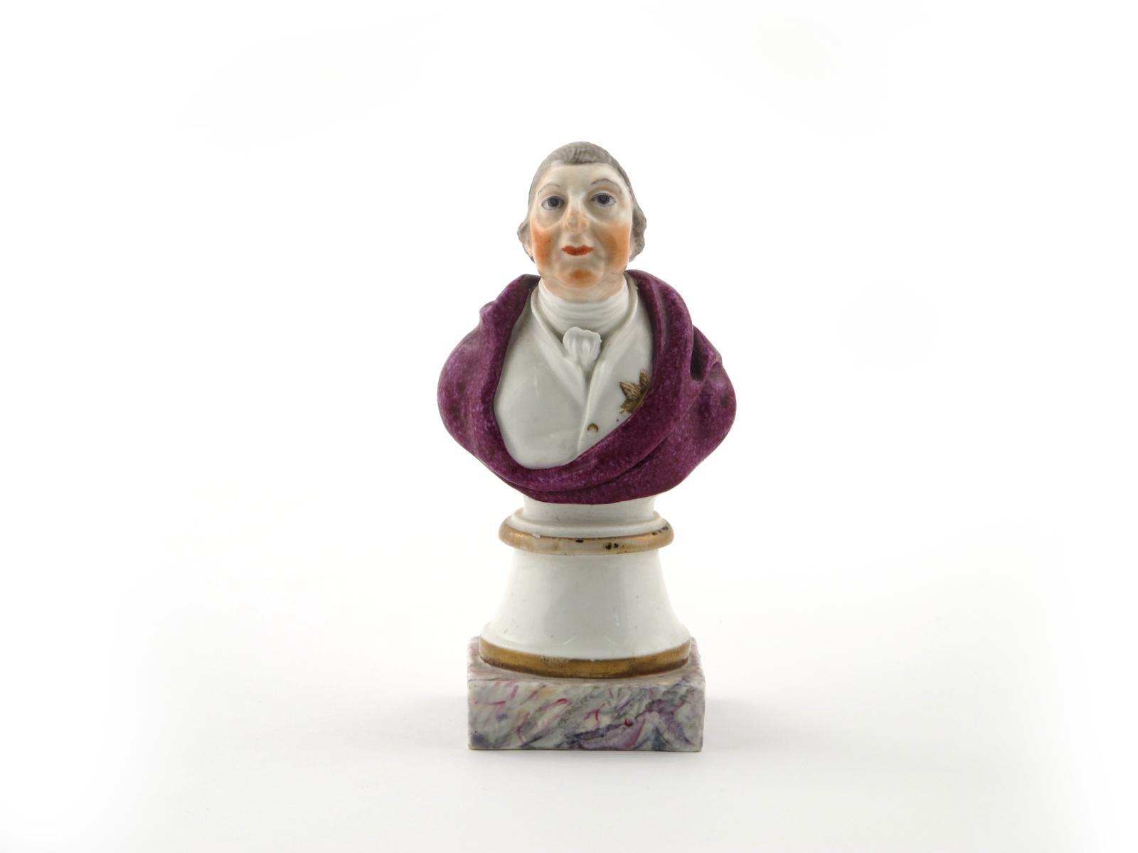 An English porcelain bust of George III 1st half 19th century, wearing a purple cloak and raised on a socle base, incised title to the reverse, 14cm.
