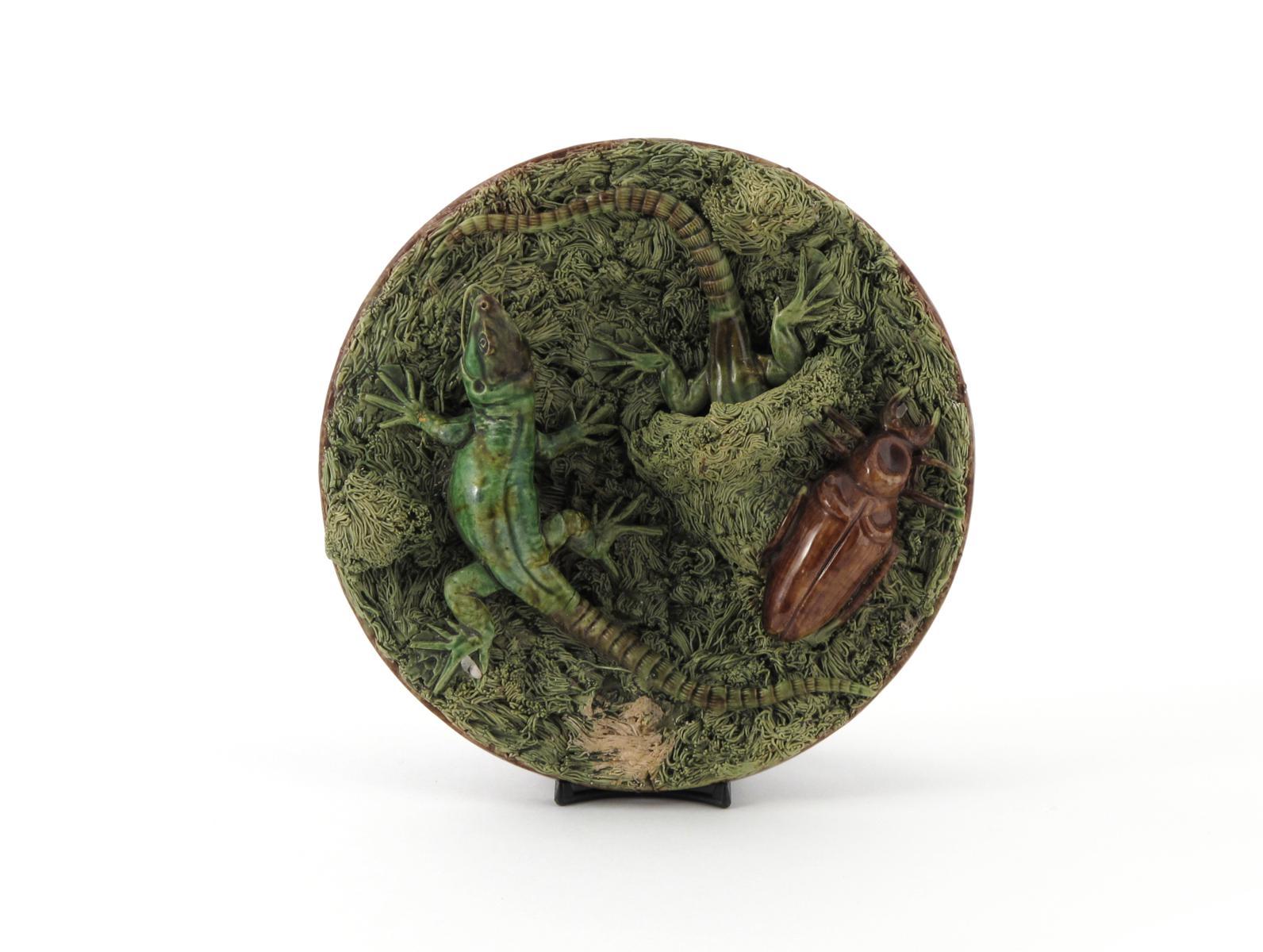 A Palissy ware dish 20th century, applied with two lizards, one hiding beneath moss, and a large stag beetle, 18.5cm.