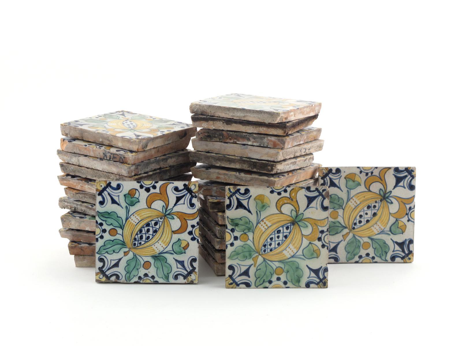 Sixty Millwall Pottery tiles, c.1880-1900, by Frederick Garrard, each painted with a central stylized fruit split to reveal its seeds, within trefoil borders, some chipping, 13.3cm. (60)