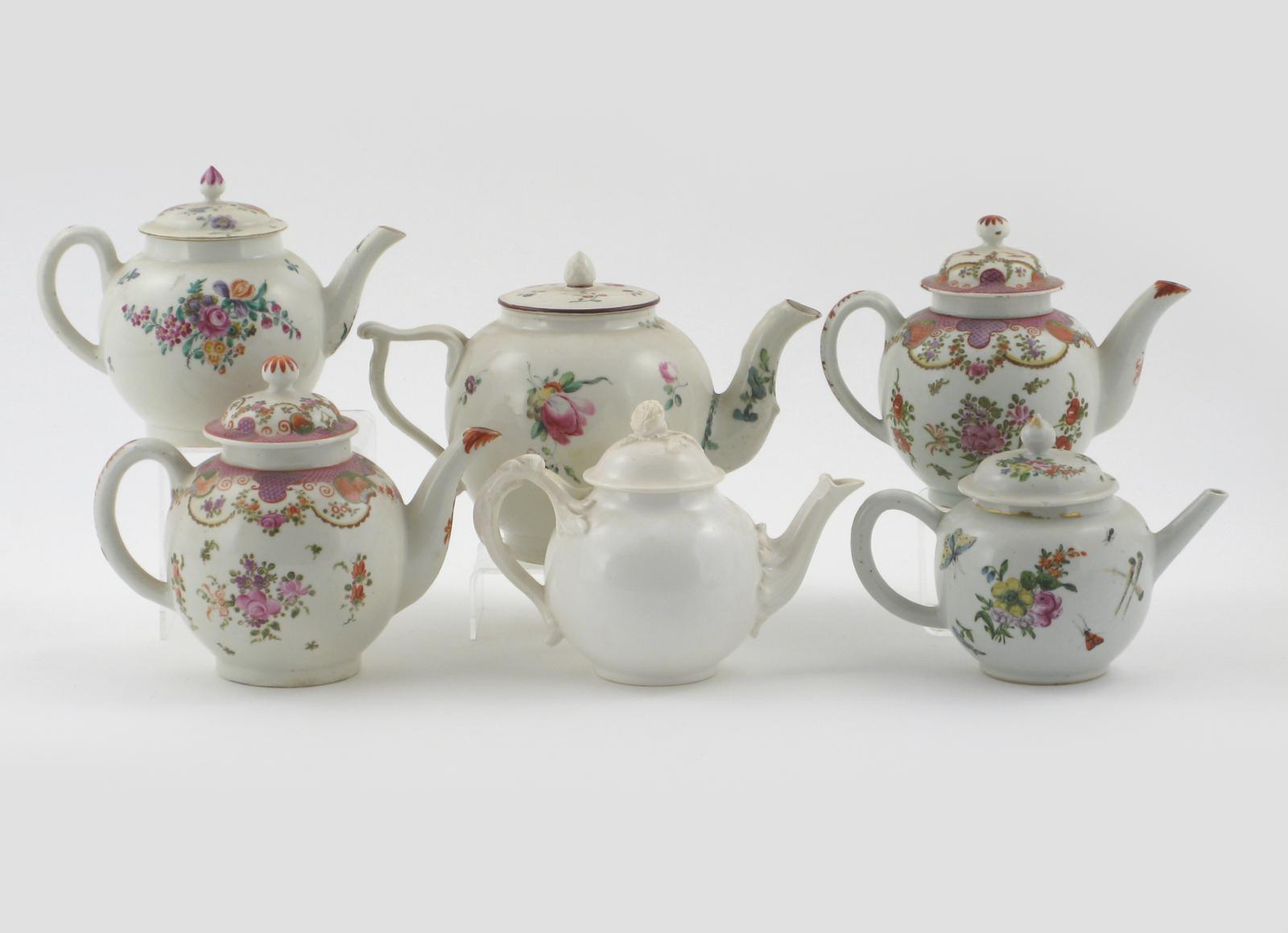 Four English porcelain teapots and covers 2nd half 18th century, two of them Lowestoft painted with flower garlands and diaper bands, a Chinese London-decorated teapot, and a white-glazed bone china teapot, some damages and restoration, 24cm max. (12)