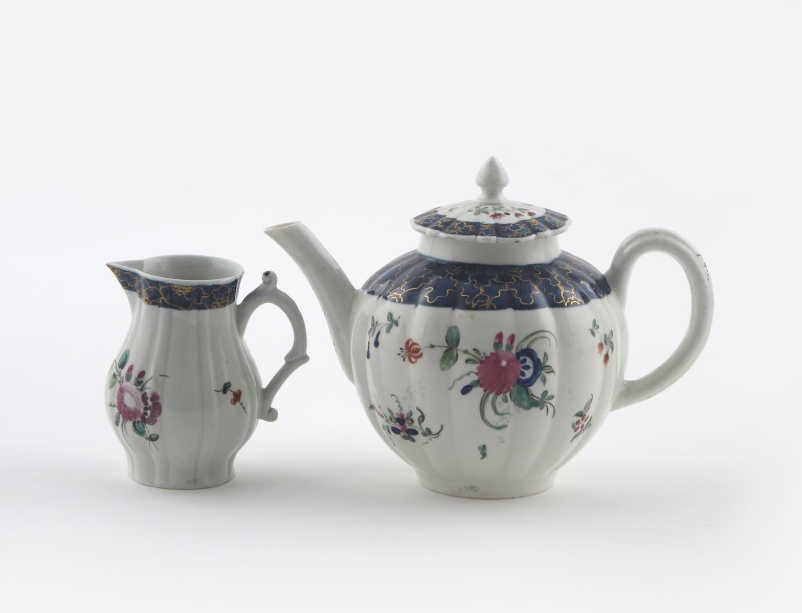 A Liverpool fluted teapot and cover c.1770, and a matching milk jug, painted with flowers beneath a blue cracked ice border, 19.5cm max. (3)