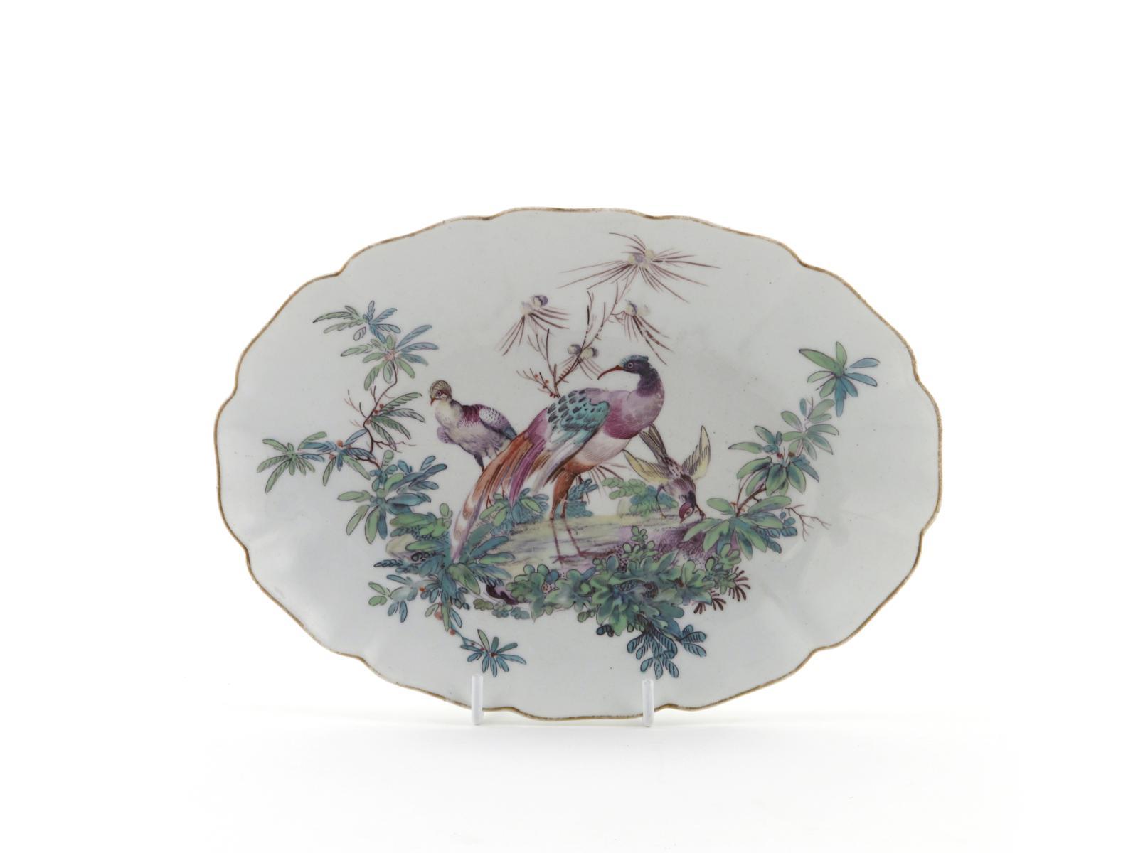 A Chelsea shaped dish c.1765, finely painted with three birds standing before leafy branches in a delicately muted palette, gold anchor mark, 22cm.