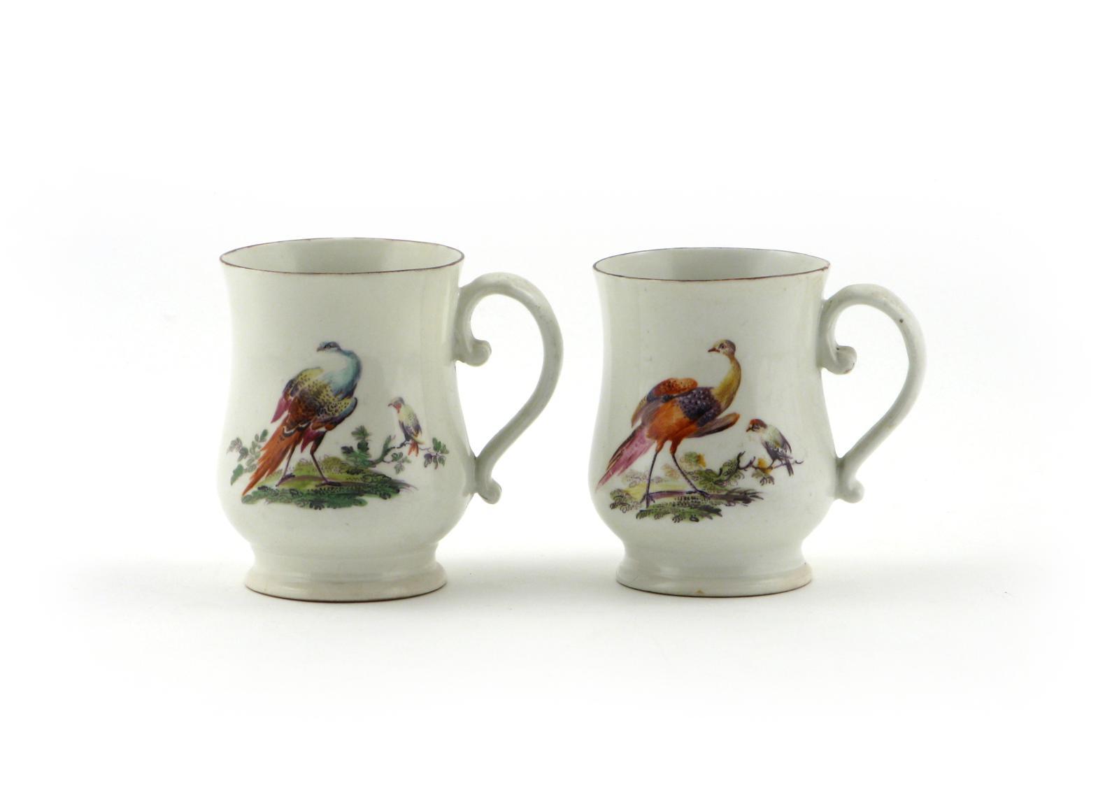 A pair of Derby mugs c.1760, each painted with a large exotic bird looking back over its shoulder, a smaller bird perched on a branch, some restoration, 11cm. (2)