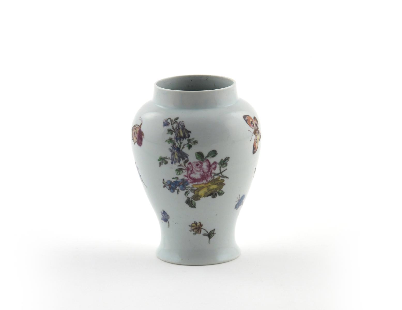 A good Vauxhall vase c.1760, decorated with polychrome flowers and scattered butterflies in fine detail, 11.8cm.