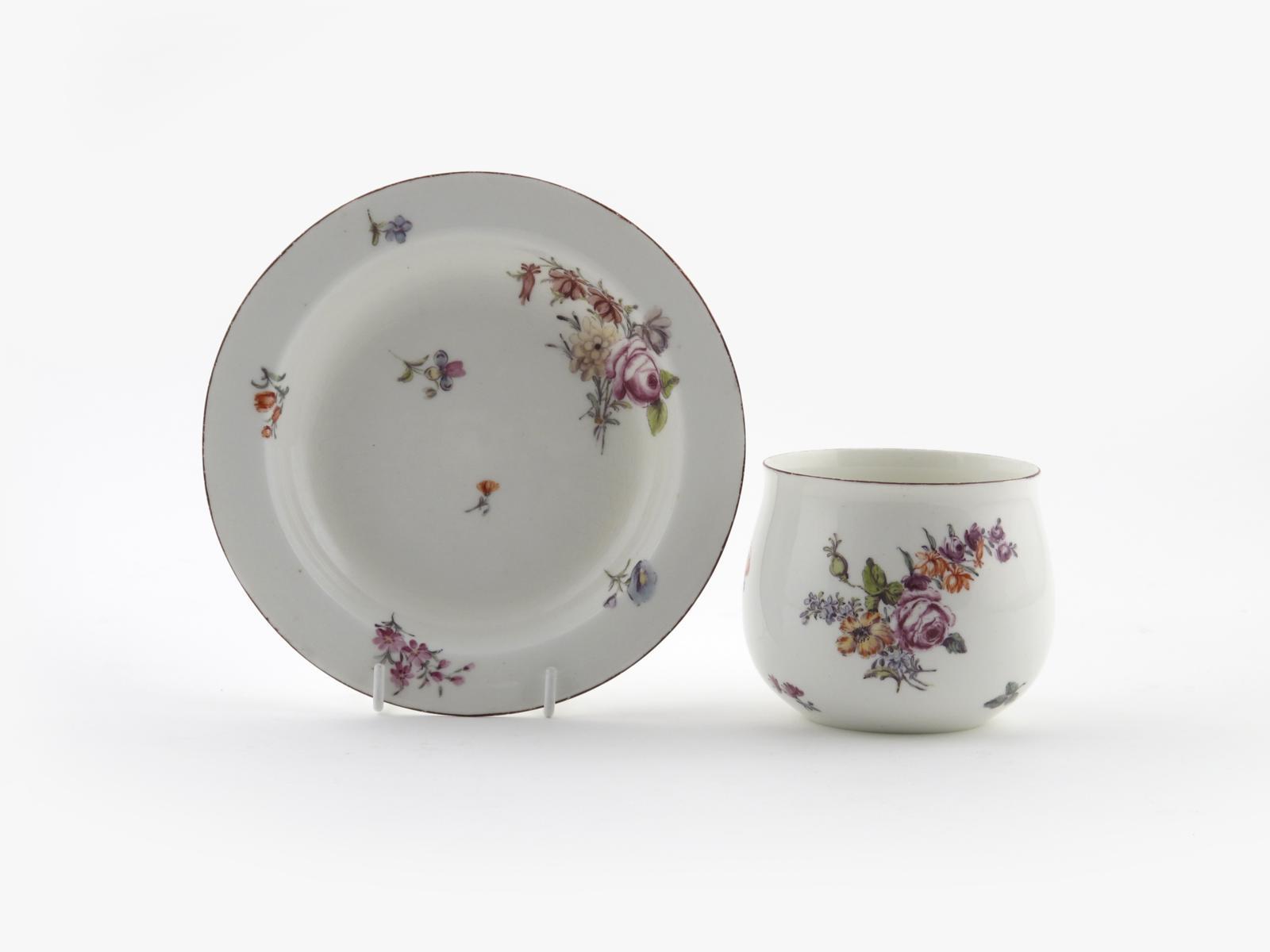 A Chelsea finger bowl and stand c.1756, finely painted with crisp flower arrangements and single scattered blooms including fuchsia, heartsease and iris, red anchor mark to the stand, a little good restoration to the stand's rim, 16.6cm. (2)