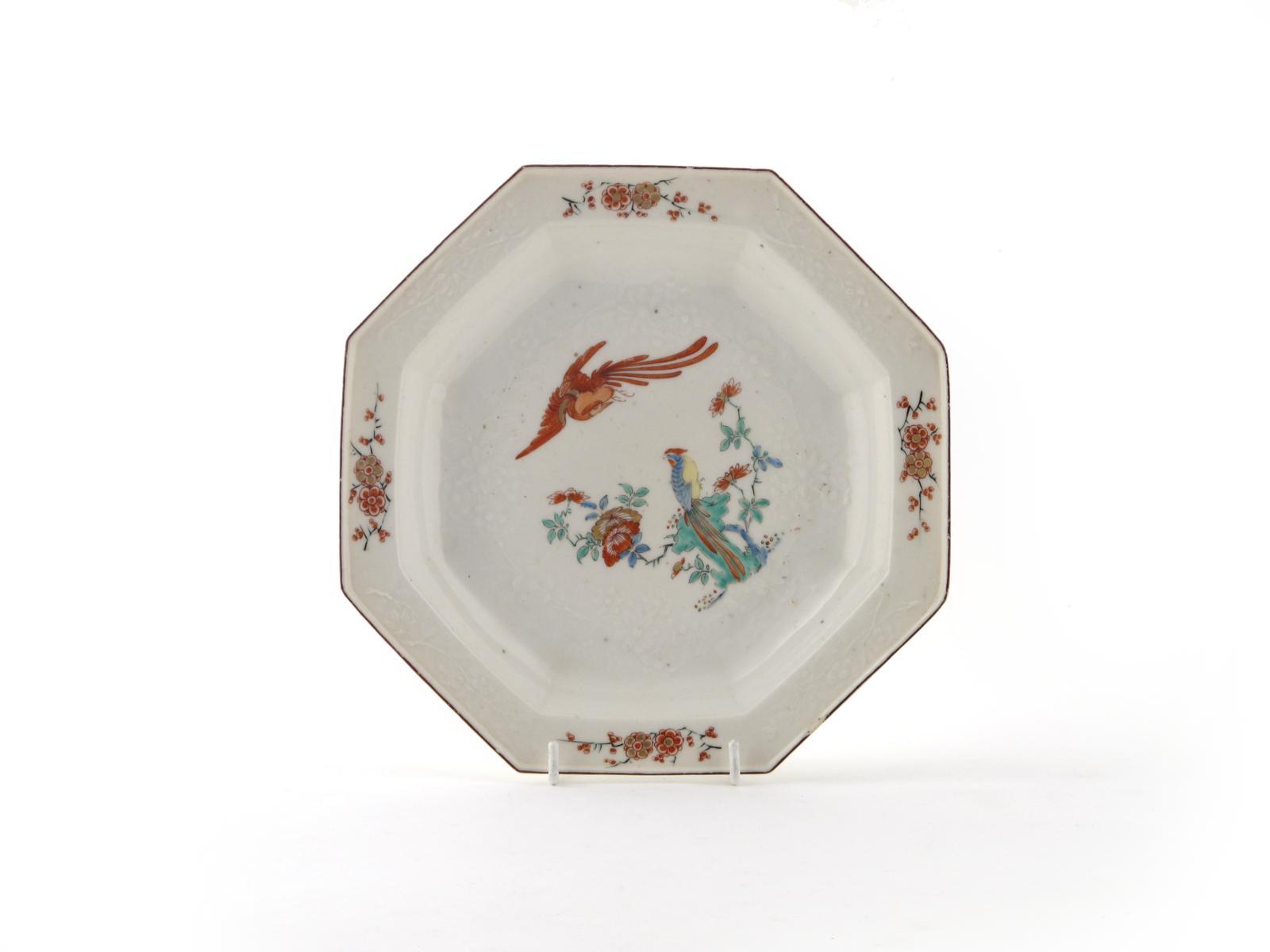 A Chelsea octagonal moulded soup plate c.1754, painted in the Kakiemon palette with a Ho Ho bird seated on rockwork, a long-tailed red bird in flight above, red anchor mark, a small rim chip, 25cm.