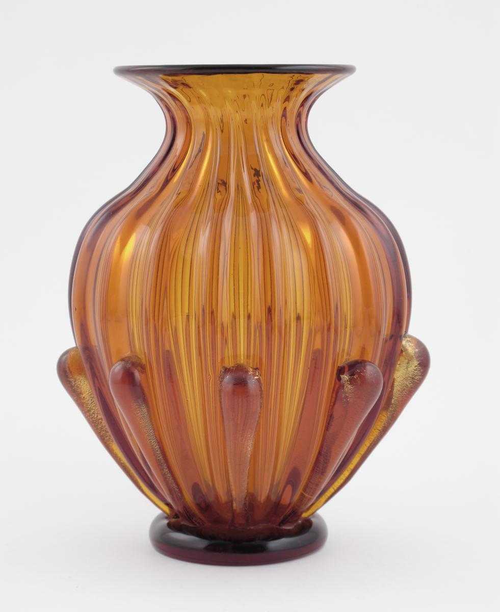 A Murano glass baluster vase, amber ribbed glass body with applied prunts highlighted with aventurine, on applied foot unsigned 29cm. high