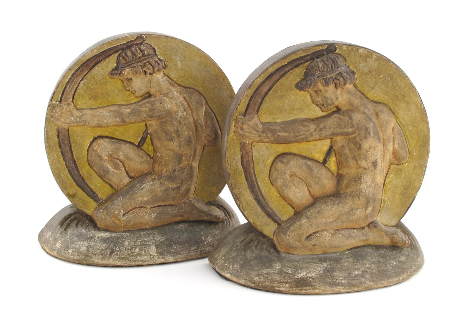 A pair of Compton Pottery book ends, circular each modelled in low relief with archer figure 18cm. high