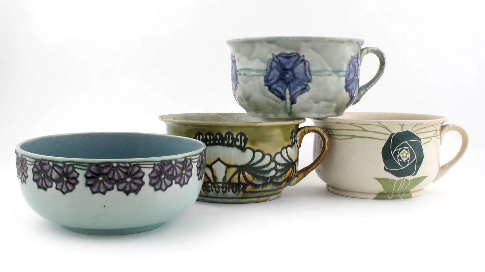 A Minton's Secessionist bowl, designed by John Wadsworth and Leon Solon, slip decorated with purple flowers on a pale blue ground, and three Minton's Secessionist chamber pots printed marks hairline to bowl, 23cm. diam.