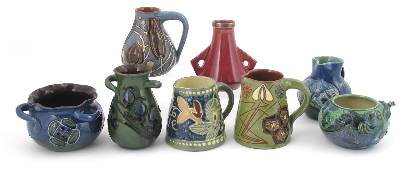 A C H Brannam, Barum Art Nouveau jug, dated 1903, possibly retailed at Liberty & Co, slip decorated with heart-shaped foliage on sinuous stems, glazed brown and blue, another similar, and six other pots incised marks, minor damages 9cm. high