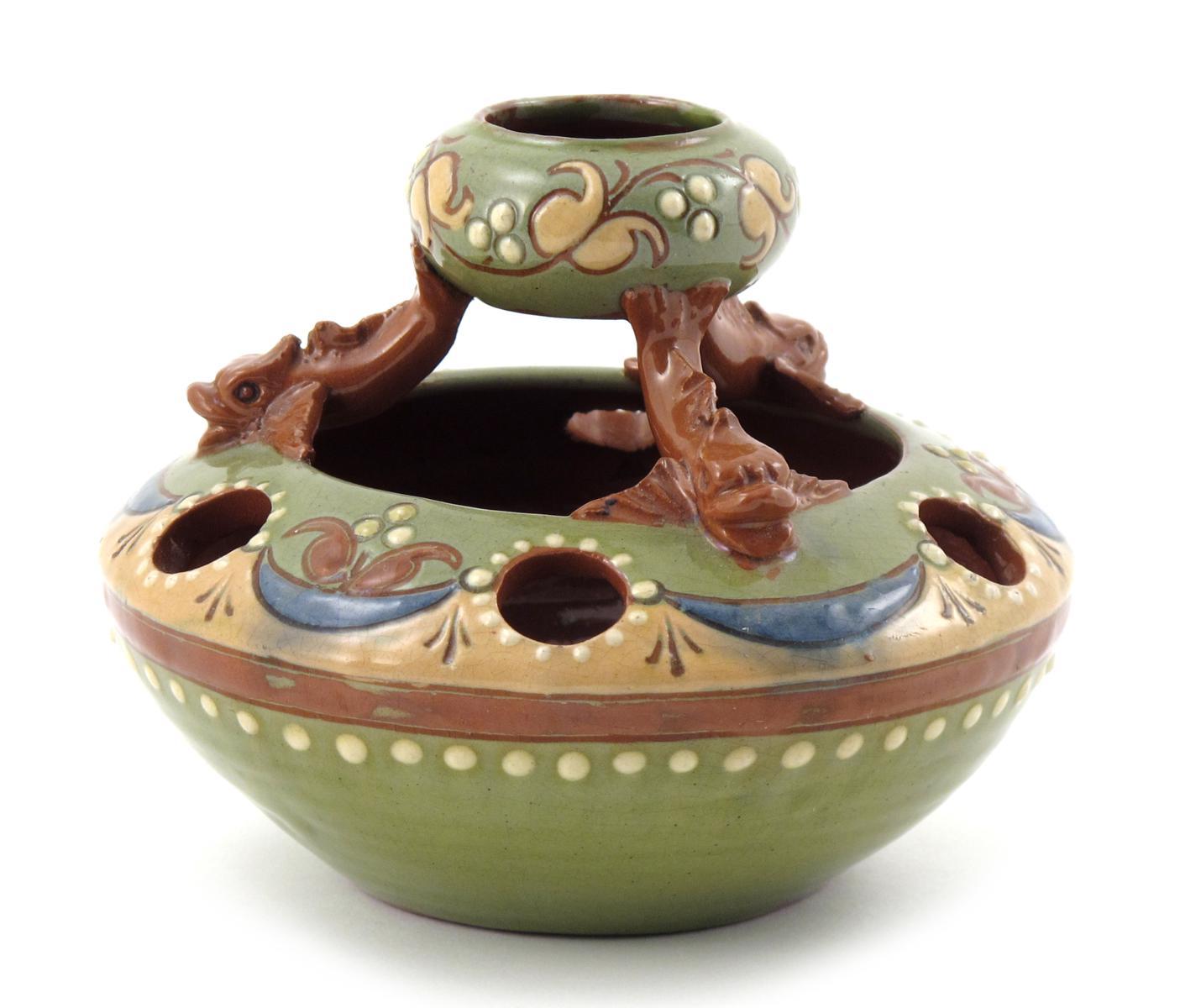A C H Brannam Pottery Dolphin vase, dated 1891, compressed ovoid body with pierced flower holes, three modelled dolphins supporting knopped neck, incised with a band of swags, glazed green, blue and ochre incised marks, dated 1891, WB monogram, professional restoration to the top rim 11cm. high