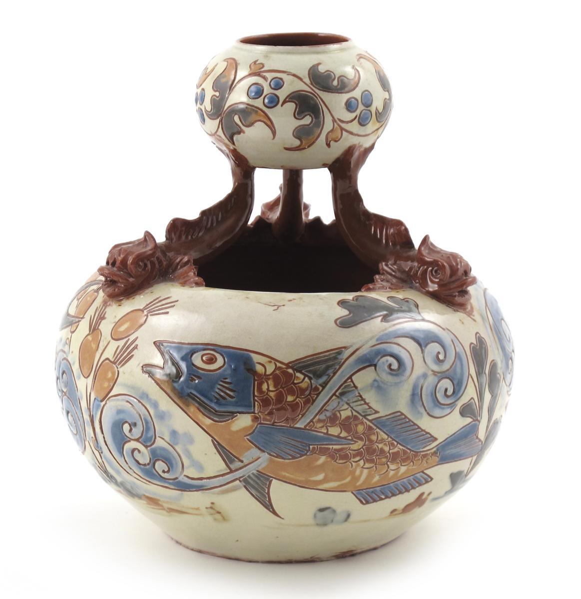 A large C H Brannam Pottery Dolphin vase, dated 1890, compressed ovoid form, the shoulder with three carved Dolphin supporting knopped neck, the body incised with scaly fish, glazed in shades of blue, ochre and green on a cream ground incised incised marks dated 1890 incised WB monogram, restored dolphins, 21cm. high