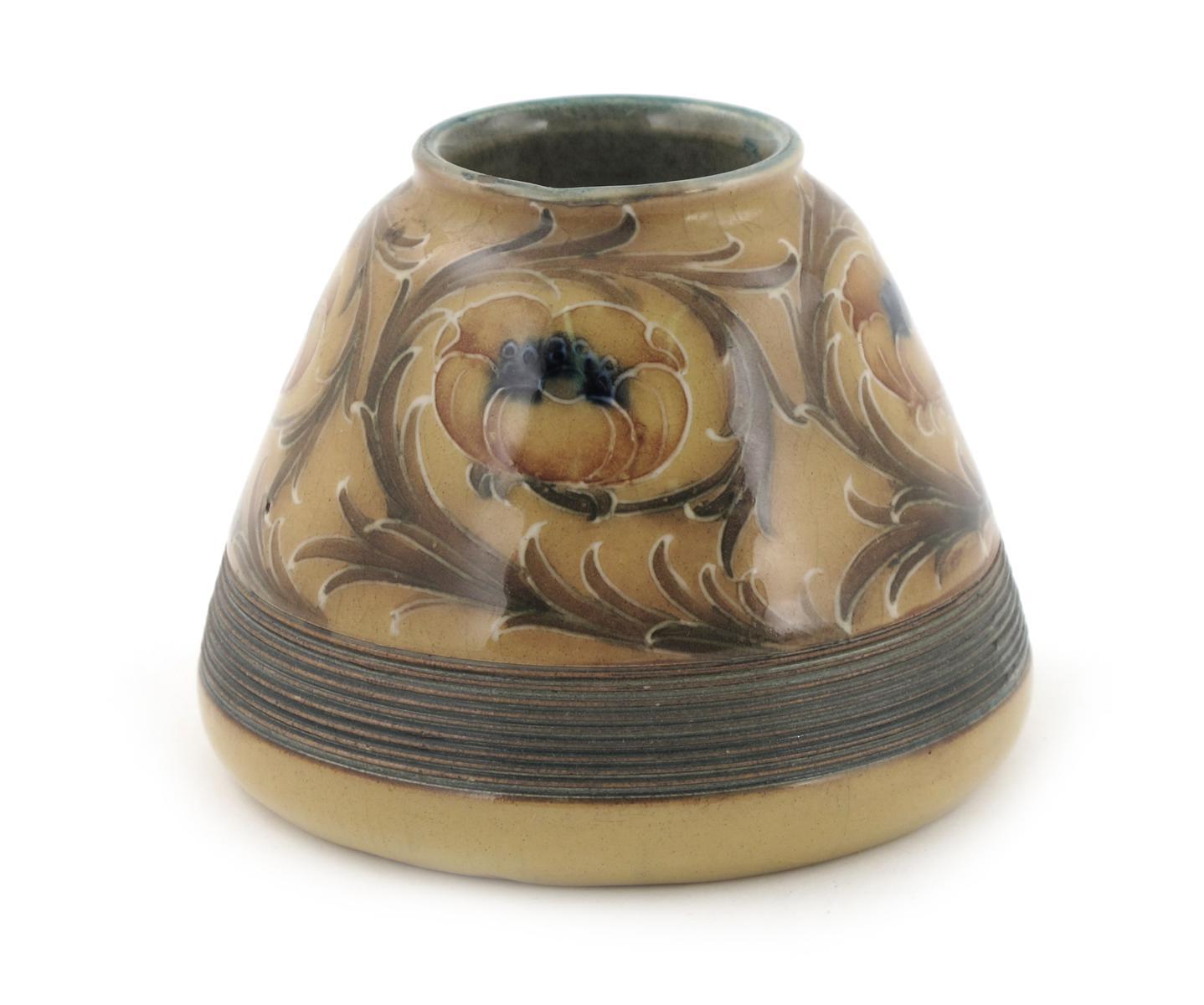'Poppy' a James Macintyre vesta, designed by William Moorcroft, painted in shades of green, blue and red on a sand ground printed factory mark, small glaze frit to top rim 8cm. high