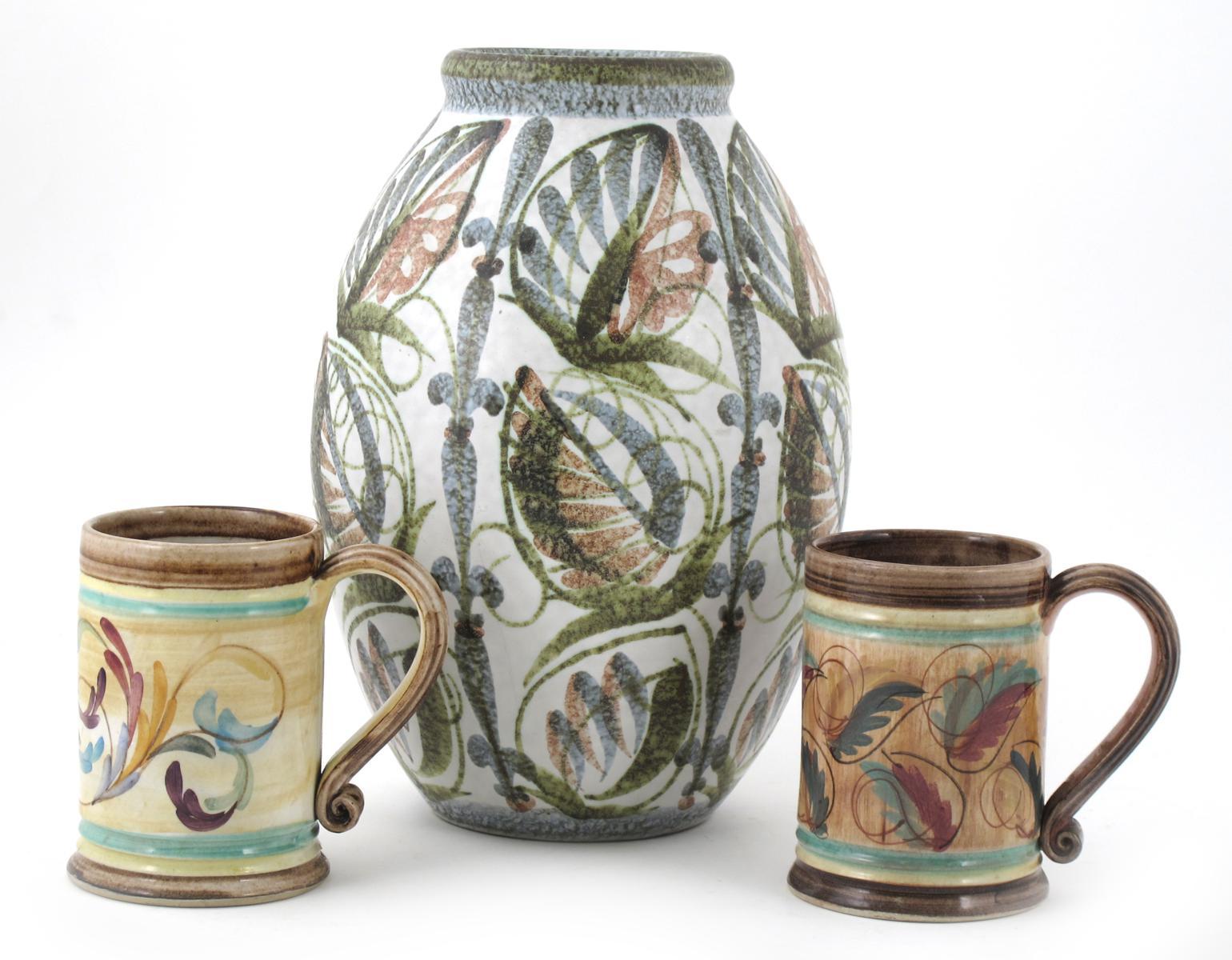 A large Denby Glynbourne Ware stoneware vase, designed by Glyn Colledge, painted in shades of grey, brown and green with foliate design, on a white ground, two mugs, and five continental encaustic tiles, printed marks 30cm. high