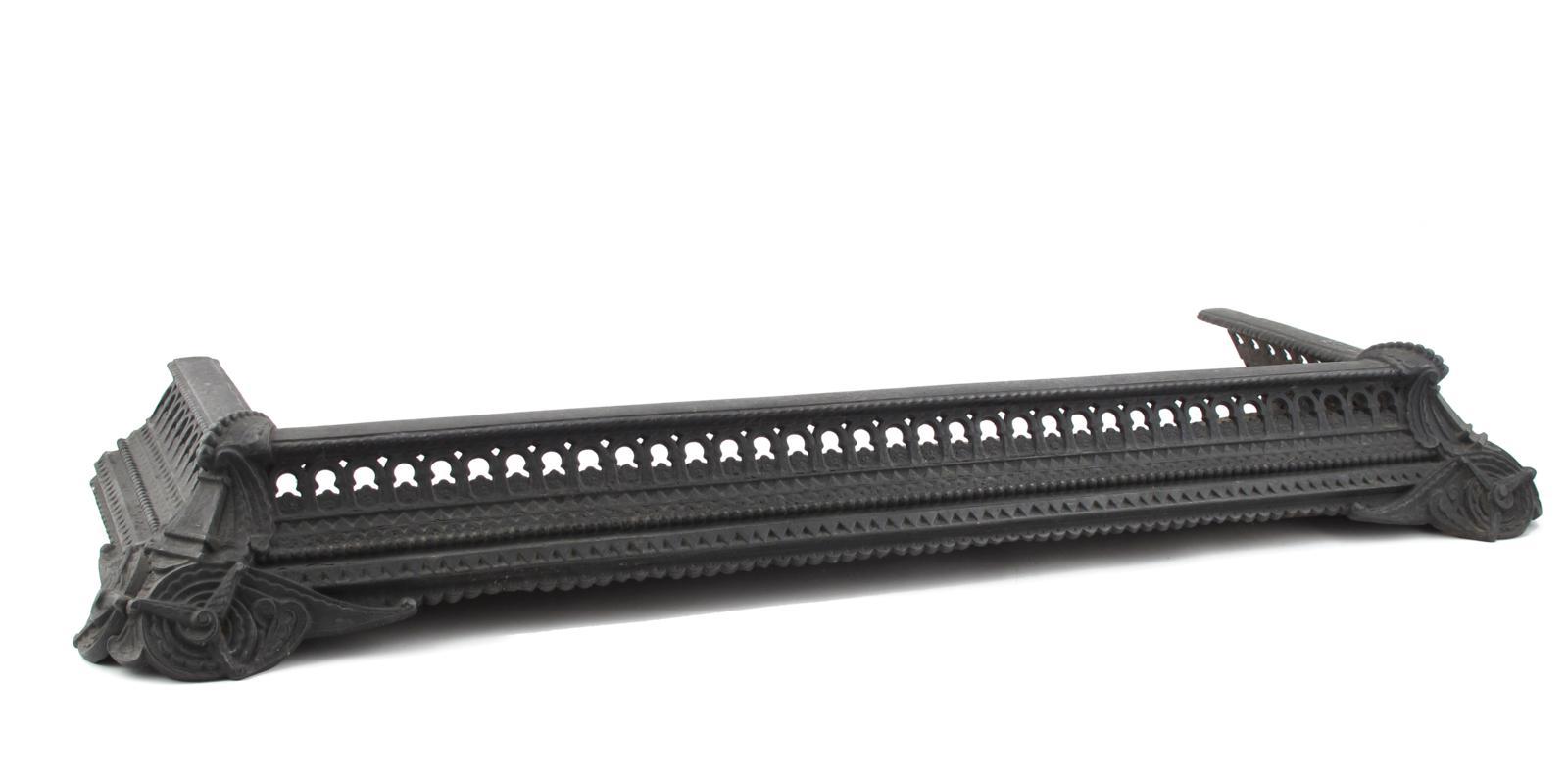 An Aesthetic Movement patinated iron fender and fire dogs, in the style of Dr Christopher Dresser, with scrolling foliate design indistinct regd diamond to fire dogs fender 105cm. wide