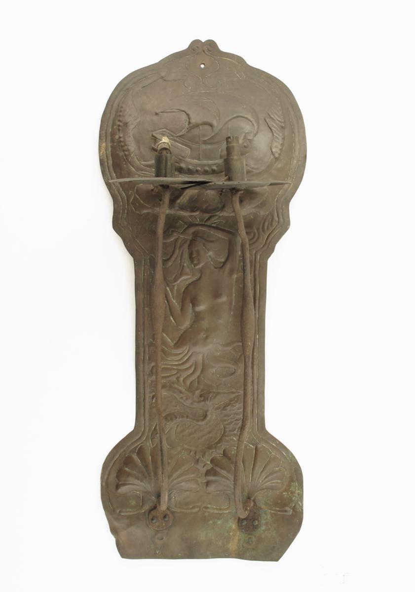 A tall Arts and Crafts patinated copper wall sconce, possibly Newlyn, hammered in low relief with a mermaid below a galleon at full sail, applied with two wrought iron sconces unsigned 80cm. high