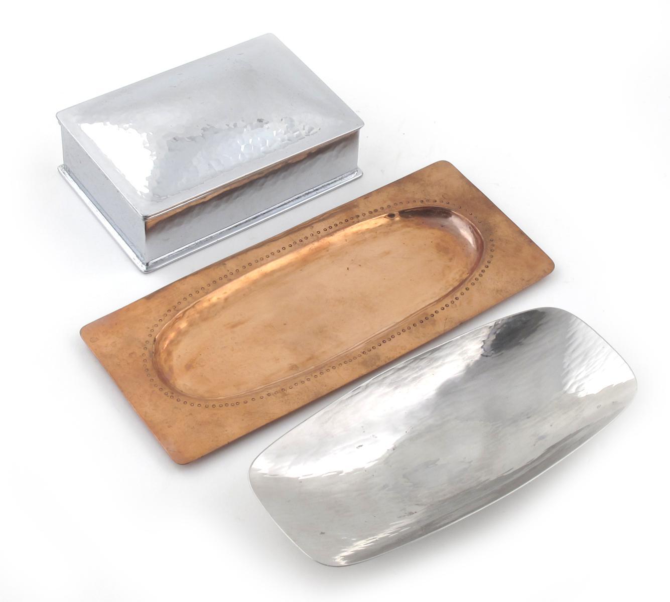 A Keswick School of Industrial Arts Chromium plated cigarette box, rectangular with hinged cover, cedar wood liner, hammered finish, and two KSIA trays stamped marks 14.5cm. wide
