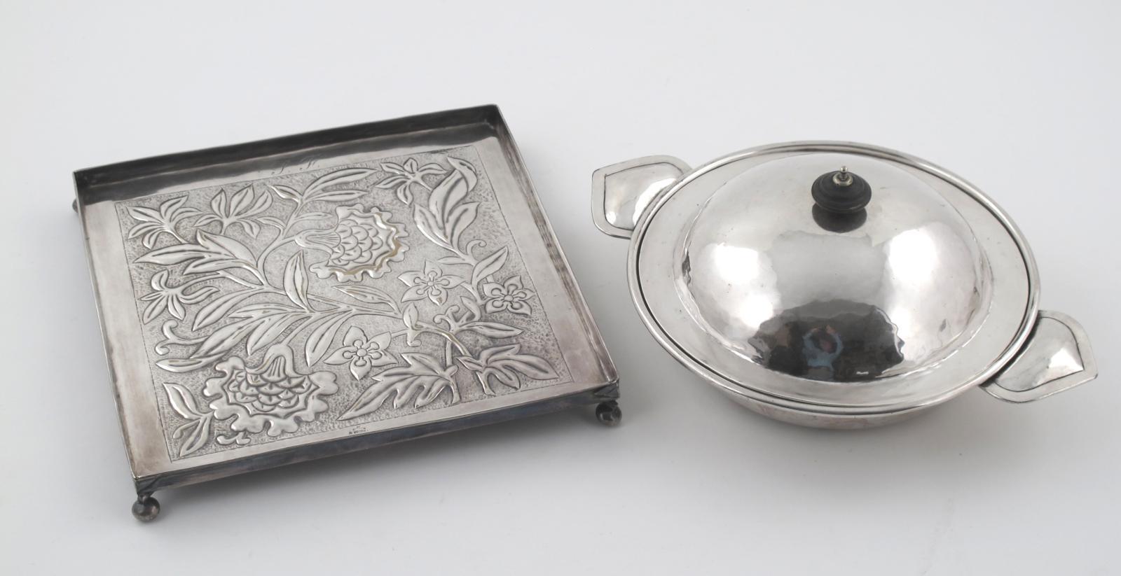 A Keswick School of Industrial Arts electroplated tray, square section, hammered in relief with a foliate design, initialled SF, on ball feet and a KSIA muffin dish and cover with silver liner stamped marks 24cm. square
