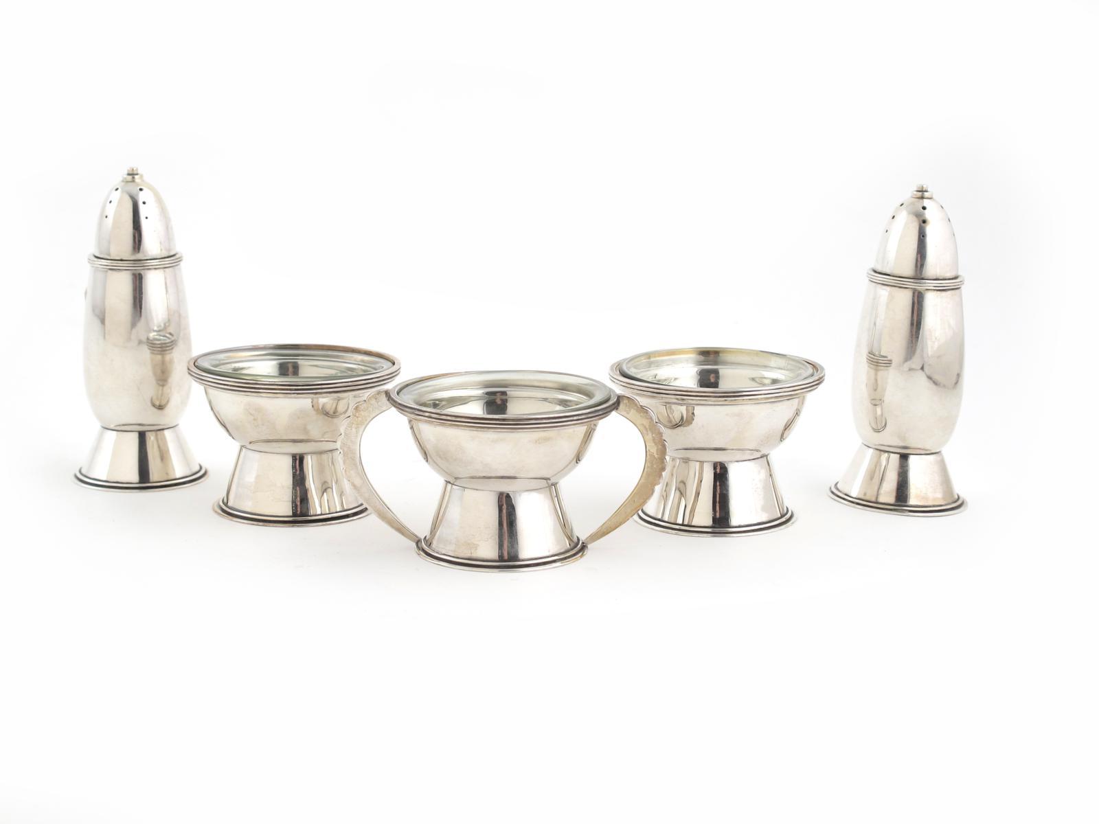An H G Murphy Falcon Works silver and glass five piece cruet set, comprising; two footed salts with pale green glass liners, a twin-handled mustard with pale green glass liner, and two pepper pots stamped marks London 1934, 10cm. high