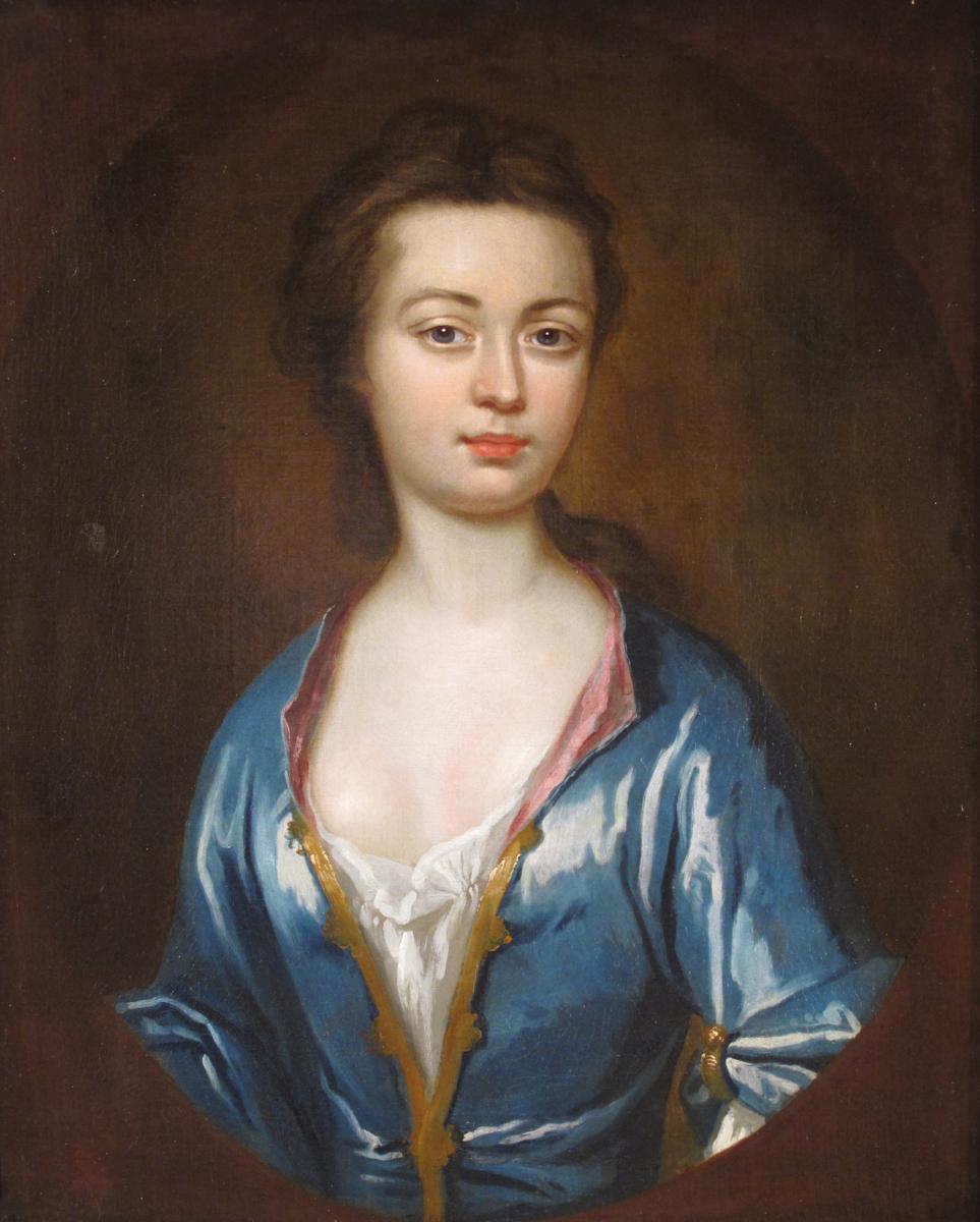 English School 18th Century Portrait of a lady, half length, wearing a blue dress Oil on canvas, in a painted oval 76 x 63cm; 30 x 25in