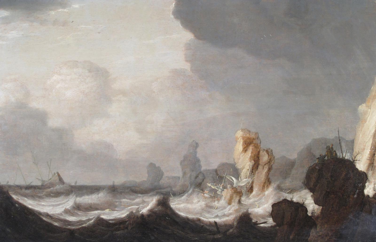 A ship foundering on rocks in a storm with figures praying on a rocky outcrop