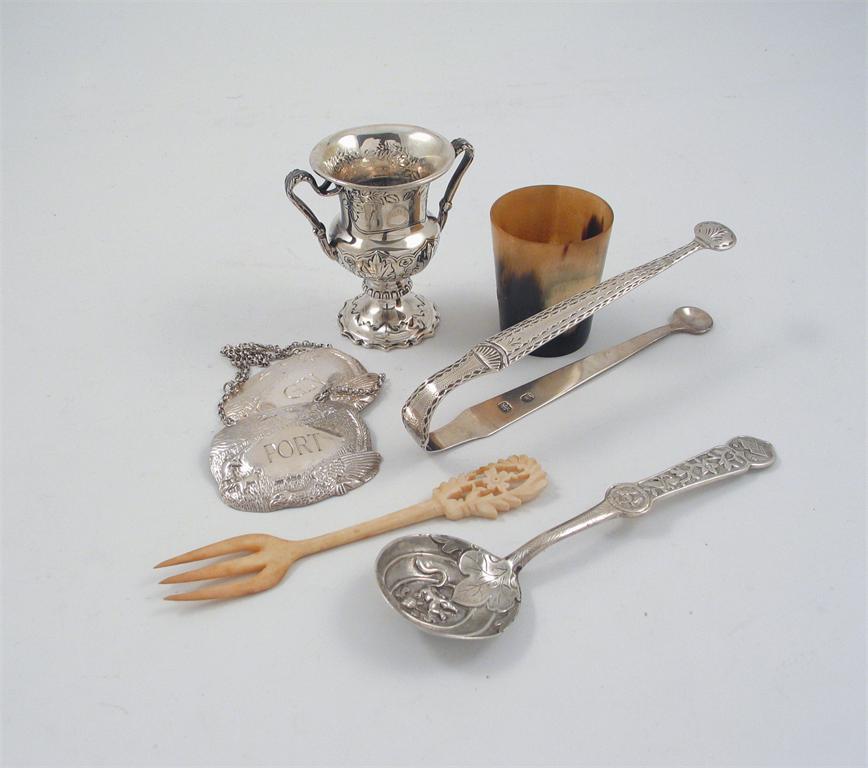 A pair of modern shooting theme wine labels, 'Port' and 'Gin' by Mappin & Webb, together with a pair of George III bright cut sugar tongs; a small two handled modern trophy cup; horn beaker, a Chinese spoon and an ivory fork, (7).