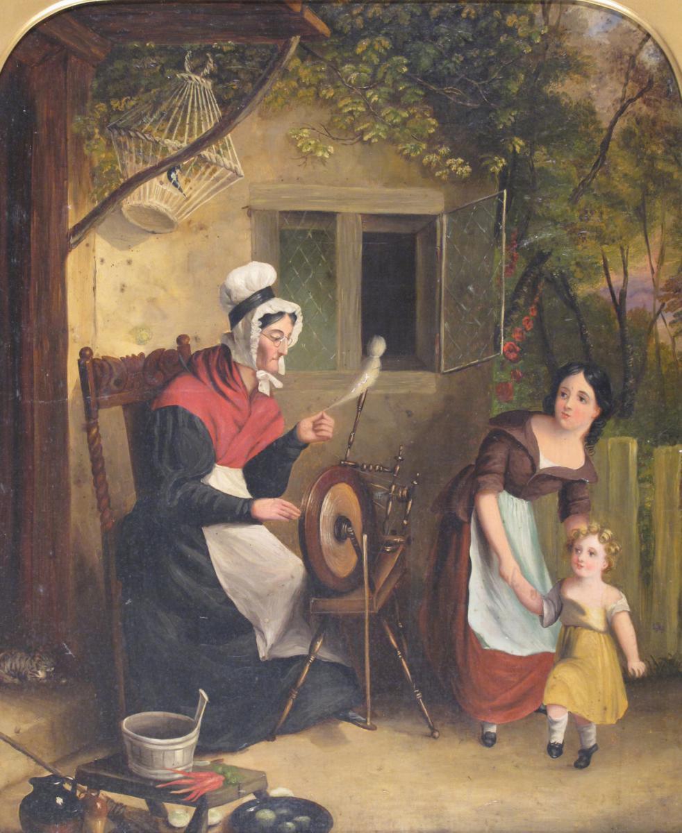 English School 19th Century Watching granny spinning Oil on canvas laid down on board 61 x 51cm; 20 x 24in