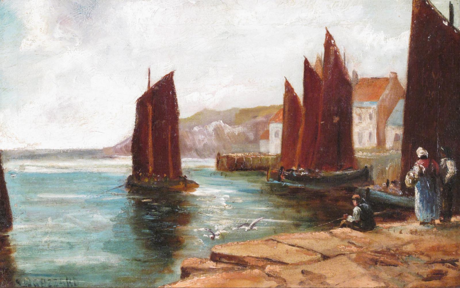 Gazzard (early 20th Century) Boats in a harbour with figures on the jetty Signed Oil on canvas 25.5 x 40.5cm; 10 x 16in