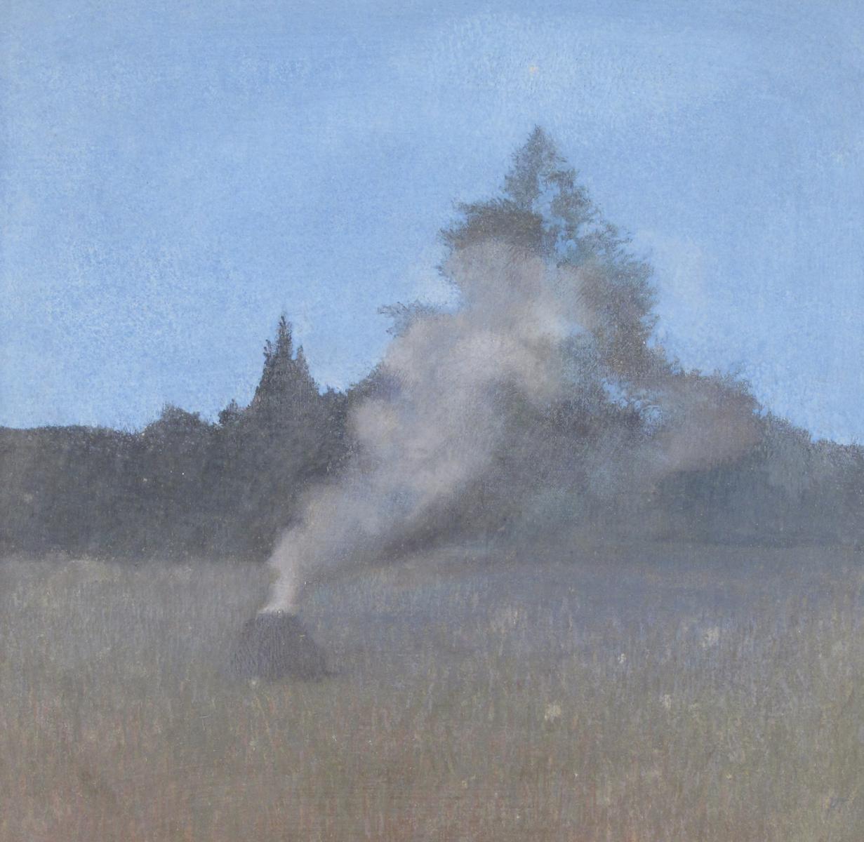 ‡David Tindle R.A. (b.1932) Bonfire at dusk Signed with initials, also signed and dated 75 verso Egg tempera 31 x 32cm; 12¼ x 12½in