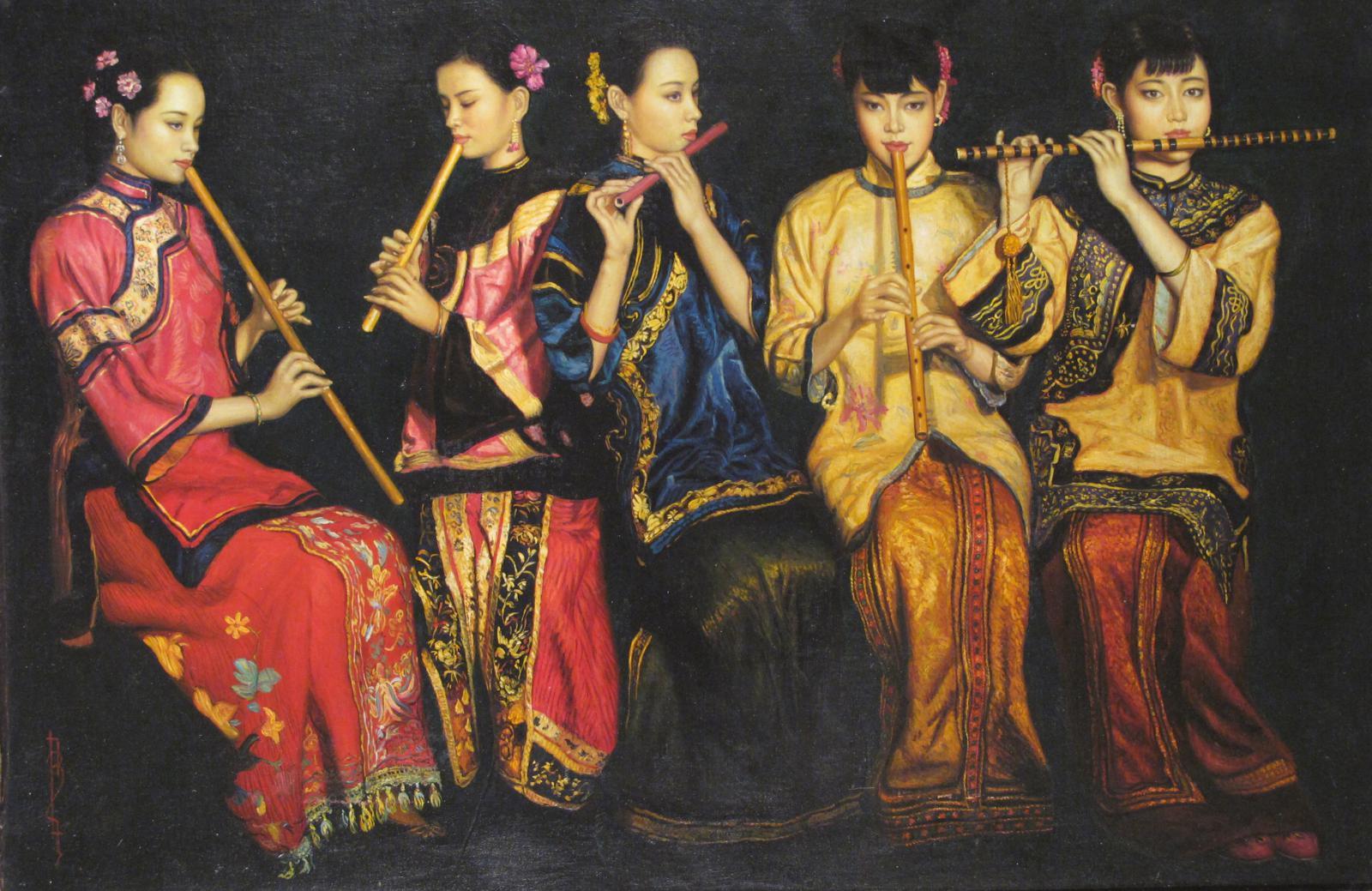 After Chen Yifei (Chinese 1946-2005) Five young women playing flutes Inscribed Oil on canvas 61 x 91cm; 24 x 36in