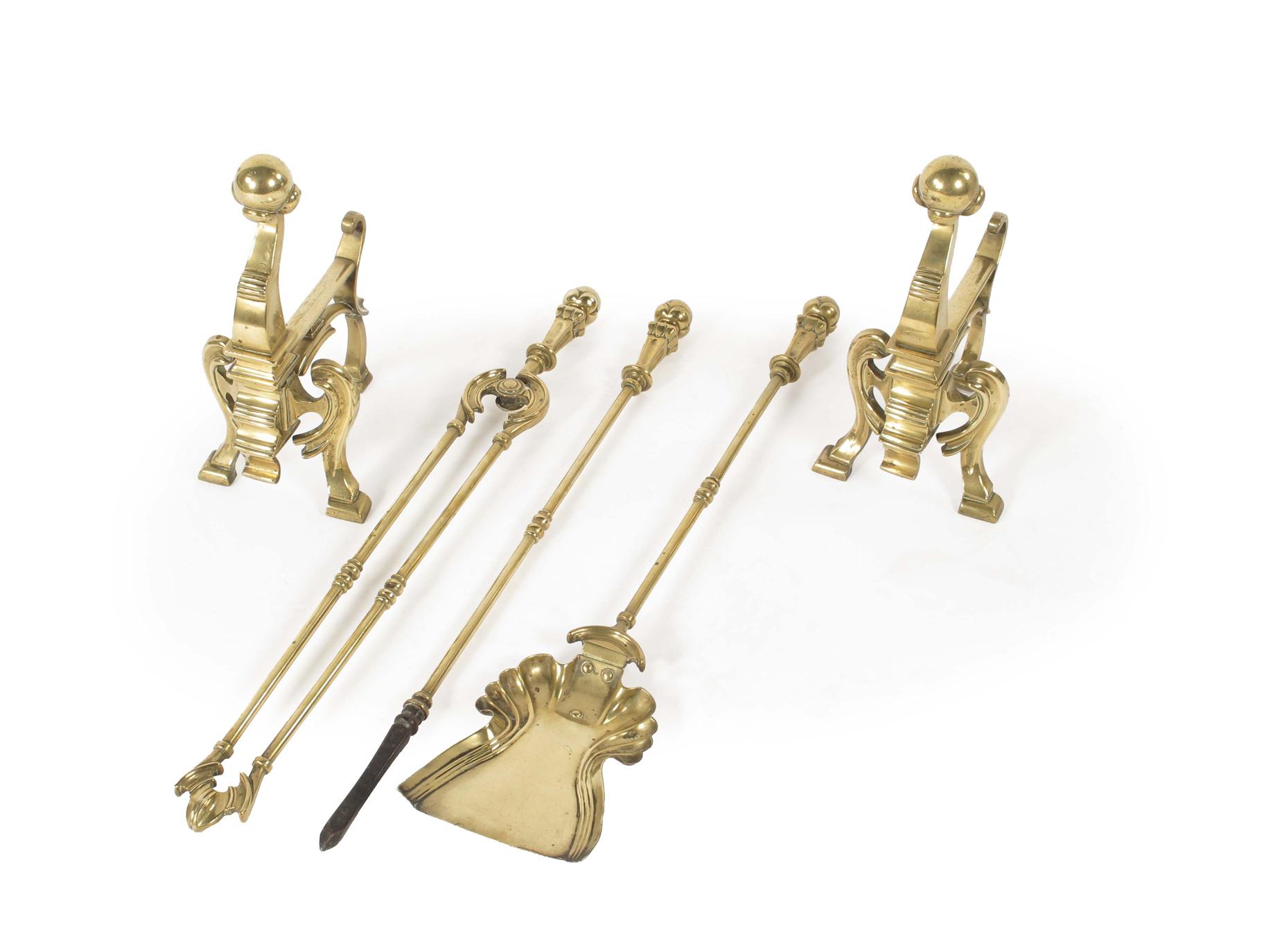 A set of three late Victorian brass fire tools, each with a stylized acorn finial and square tapering handle, together with a pair of matching andirons, the shovel: 28.75in (73cm) l. (5)