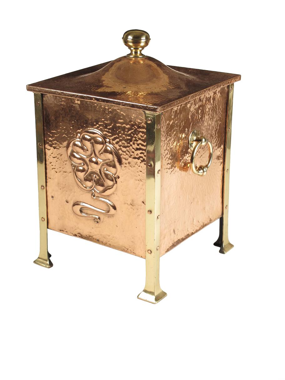 A hammered copper square coal bin, the front embossed a stylized rose, side handles, brass legs and a domed cover, 18.5in (47cm) h, 11.75in (30cm) sq.