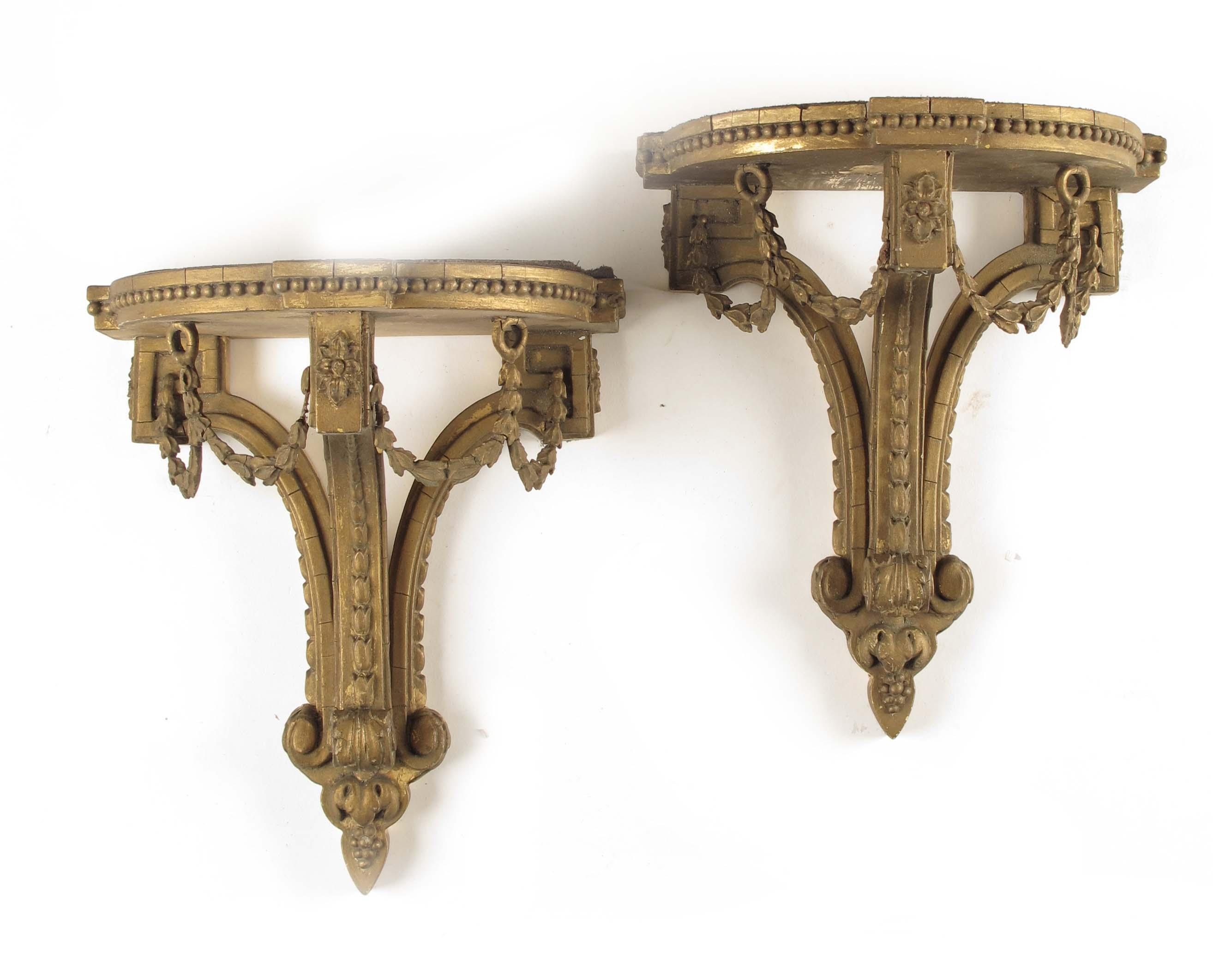 A pair of late 19th century giltwood and gesso brackets, with husk garland decoration, 10.75in (27.5cm) h, 9.25in (23.5cm) w, 5.5in (14cm) d. (2)