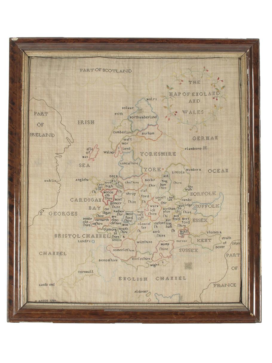 A late George III needlework Map of England and Wales, by A. Anson, dated 1791, the title with a floral border, 25 x 21.5in (63.5 x 53.5cm) in a later rosewood frame.