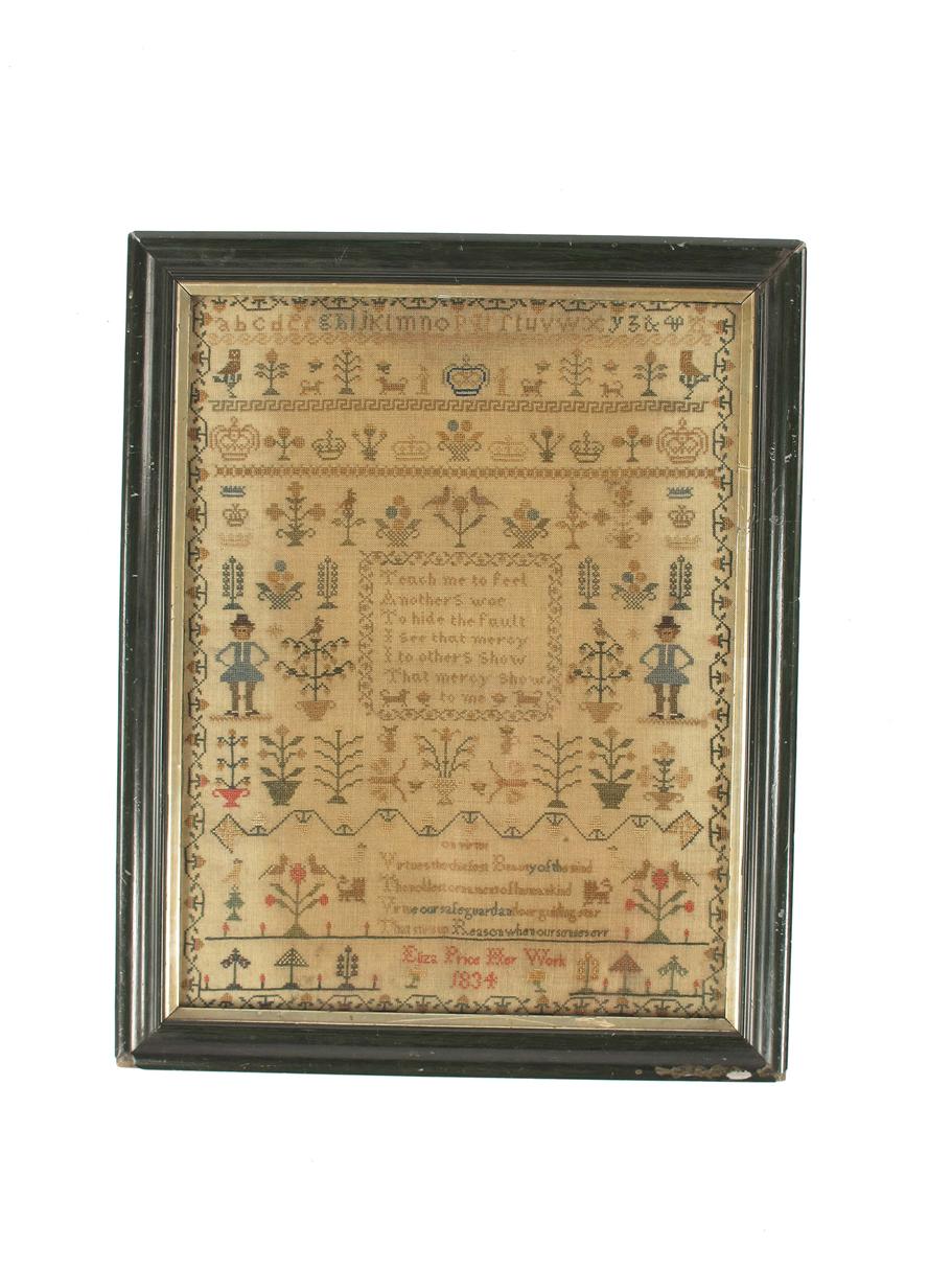 A William IV needlework sampler, by Eliza Price, 1834, worked with an alphabet, crowns, urns of flowers, birds, blue coated figures and verse, within a flower border, 16.5 x 12.5in (41.6 x 31.3cm) in a later glazed and painted frame. Discoloured and with some holes.